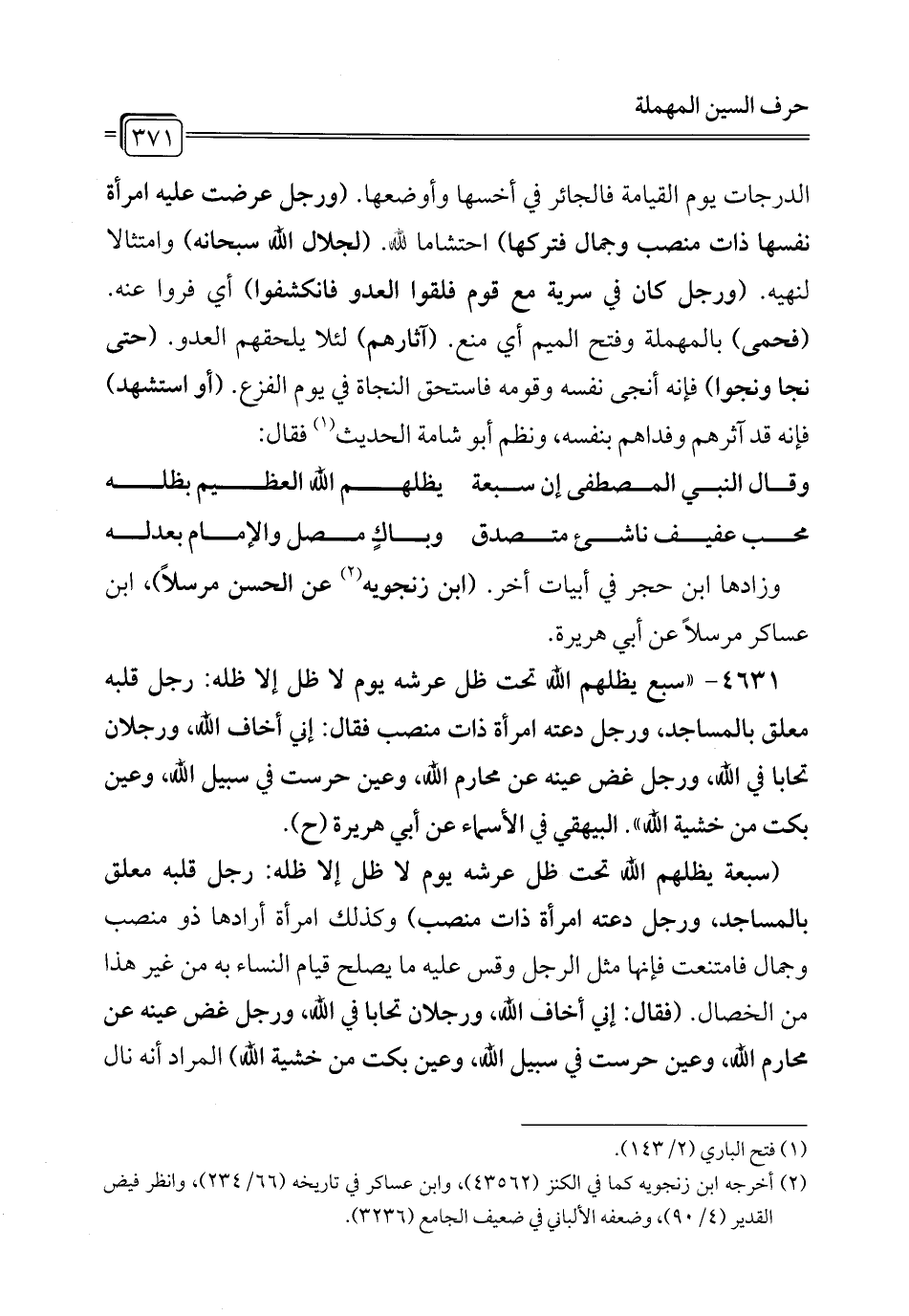 4631 - "سبع يظلهم الله تحت ظل عرشه يوم لا ظل إلا ظله: رجل قلبه معلق بالمساجد، ورجل دعته امرأة ذات منصب فقال: إني أخاف الله، ورجلان تحابا في الله، ورجل غض عينه عن محارم الله، وعين حرست في سبيل الله، وعين بكت من خشية الله". البيهقي في الأسماء عن أبي هريرة (ح).