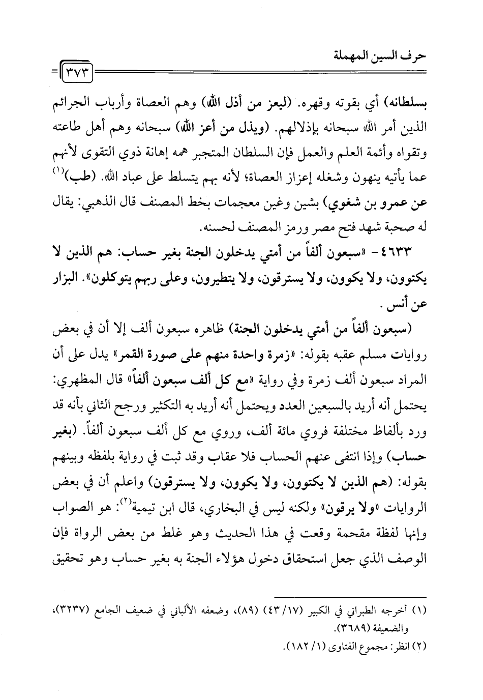 4633 - "سبعون ألفاً من أمتي يدخلون الجنة بغير حساب: هم الذين لا يكتوون، ولا يكوون، ولا يسترقون، ولا يتطيرون، وعلى ربهم يتوكلون". البزار عن أنس.