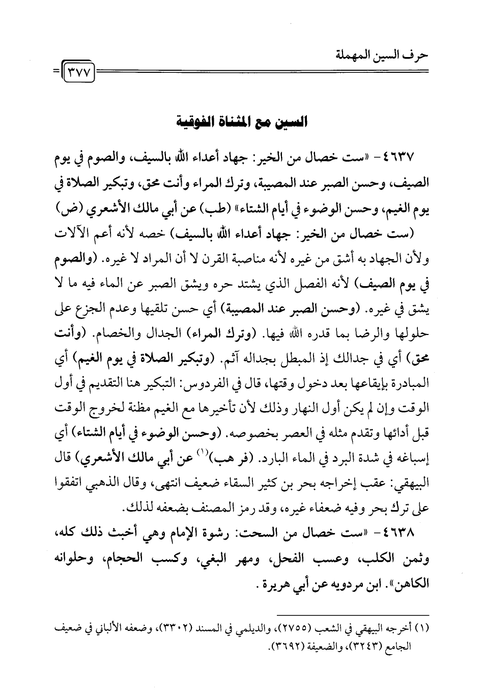 4637 - " ست خصال من الخير: جهاد أعداء الله بالسيف، والصوم في يوم الصيف، وحسن الصبر عند المصيبة، وترك المراء وأنت محق، وتبكير الصلاة في يوم الغيم، وحسن الوضوء في أيام الشتاء" (طب) عن أبي مالك الأشعري (ض)