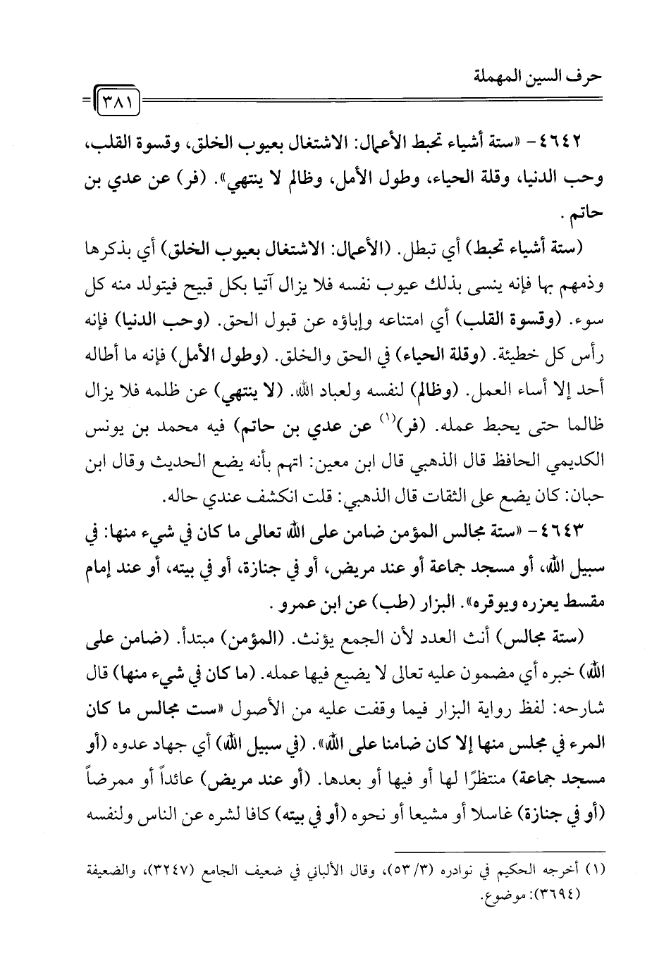 4642 - "ستة أشياء تحبط الأعمال: الاشتغال بعيوب الخلق، وقسوة القلب، وحب الدنيا، وقلة الحياء وطول الأمل، وظالم لا ينتهي". (فر) عن عدي بن حاتم.