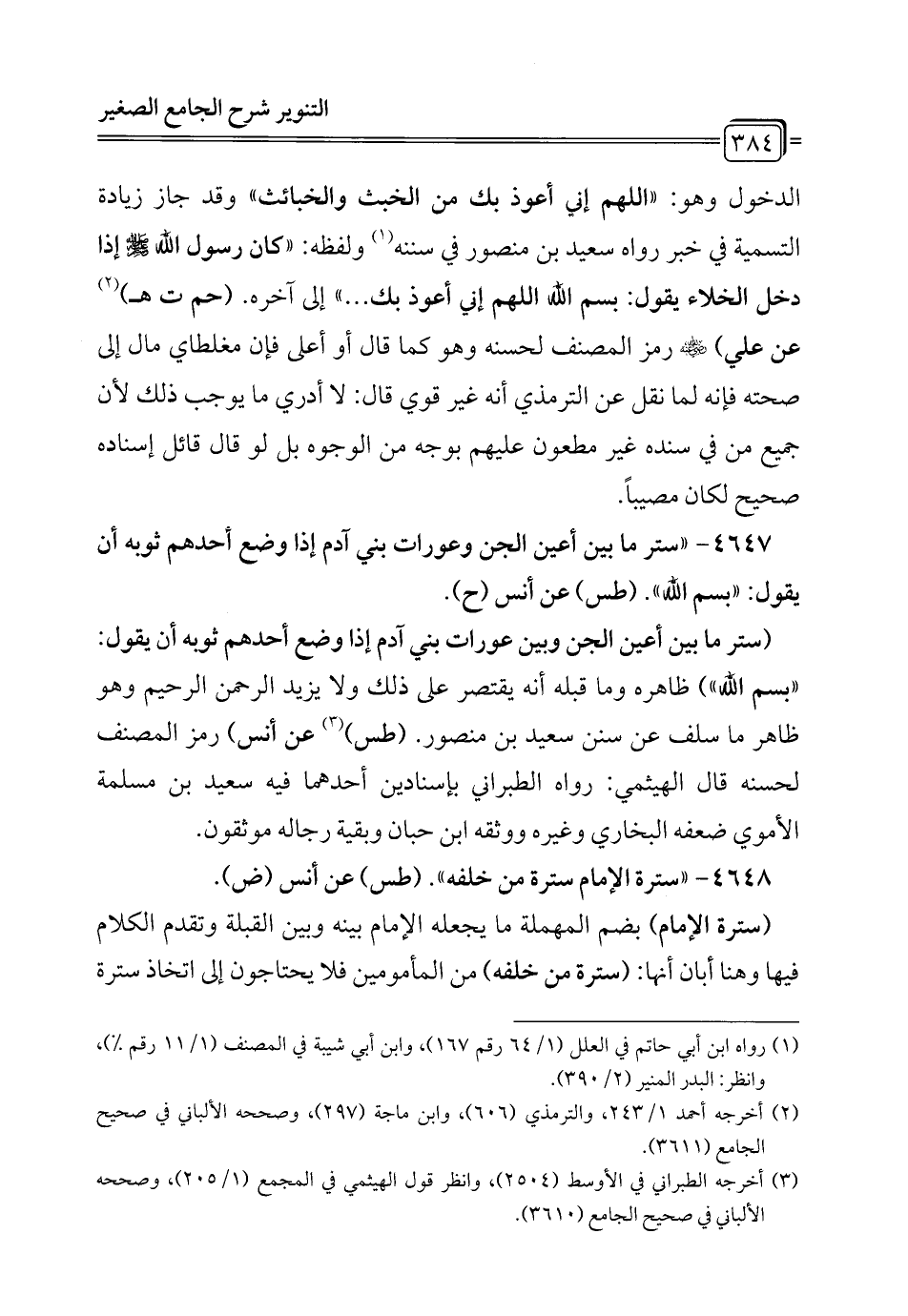 4647 - "ستر ما بين أعين الجن وعورات بني آدم إذا وضع أحدهم ثوبه أن يقول: "بسم الله". (طس) عن أنس (ح).
