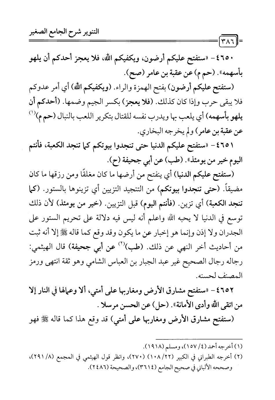 4650 - "ستفتح عليكم أرضون، ويكفيكم الله، فلا يعجز أحدكم أن يلهو بأسهمه". (حم م) عن عقبة بن عامر (صح).