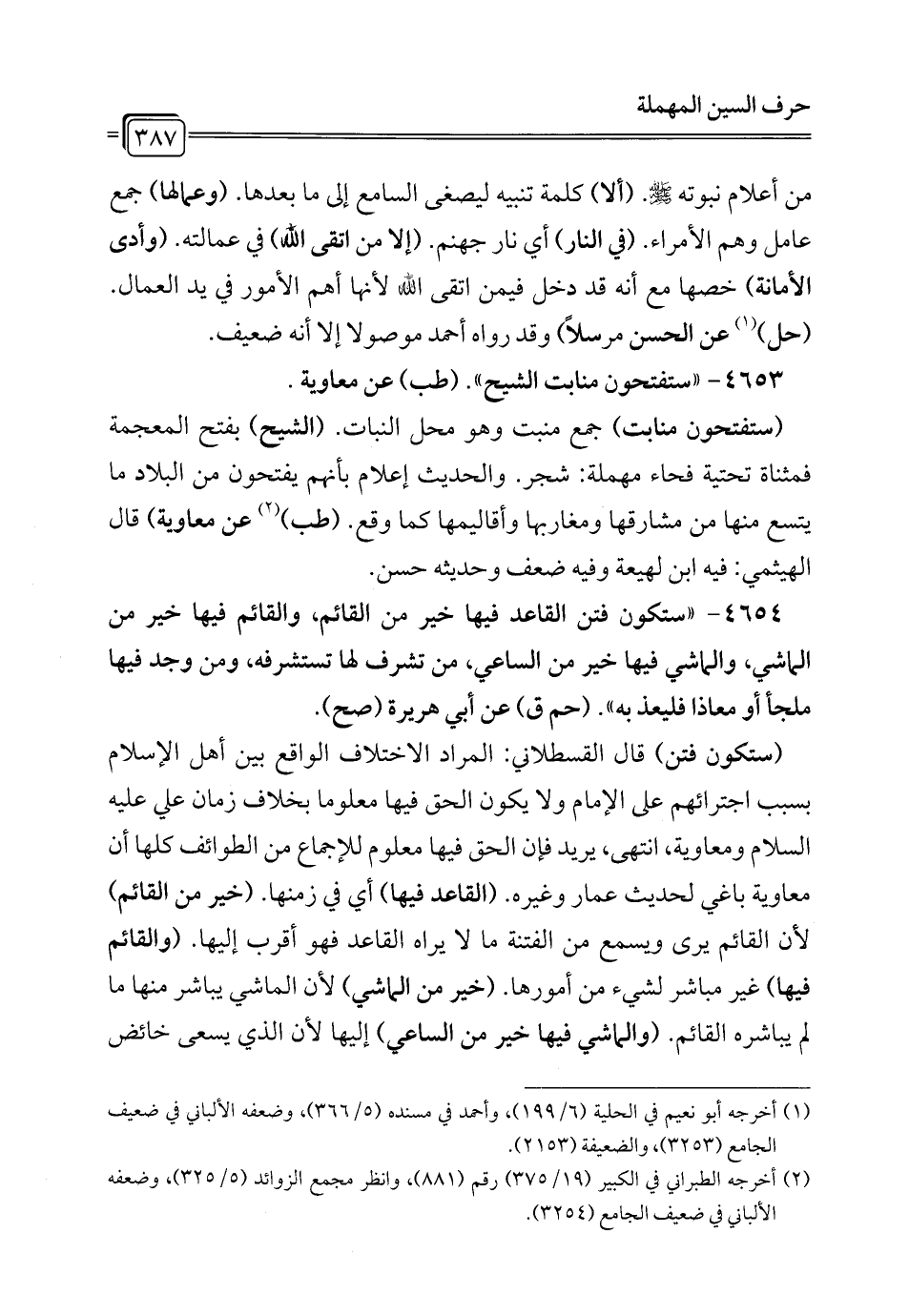 4654 - "ستكون فتن القاعد فيها خير من القائم، والقائم فيها خير من الماشي، والماشي فيها خير من الساعي، من تشرف لها تستشرفه، ومن وجد فيها ملجأ أو معاذا فليعذ به". (حم ق) عن أبي هريرة (صح).