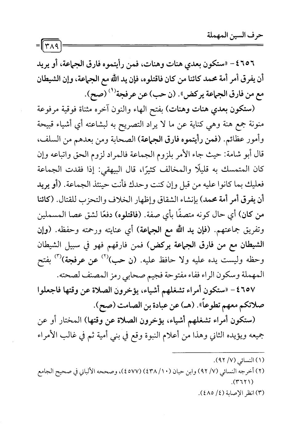 4656 - "ستكون بعدي هنات وهنات، فمن رأيتموه فارق الجماعة أو يريد أن يفرق أمر أمة محمَّد كائنا من كان فاقتلوه، فإن يد الله مع الجماعة، وإن الشيطان مع من فارق الجماعة يركض". (ن حب) عن عرفجة (¬1) (صح).