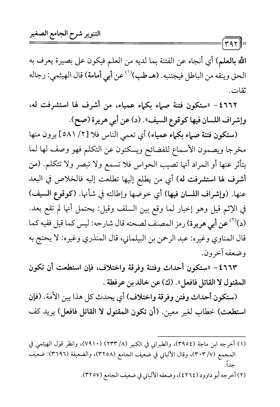 (ستكون فتنة صماء بكماء عمياء) أي تعمي الناس فلا [2/ 581] يرون منها مخرجا ويصمون الأسماع للفضائح ويسكتون عن التكلم فهو وصف لها لما يتأثر عنها أو المراد أنها تصيب الحواس فلا تسمع ولا تبصر ولا تتكلم. (من أشرف لها استشرفت له) أي من يطلع إليها تطلعت إليه فالخلاص في البعد عنها. (وإشراف اللسان فيها) أي خوضها وإطالته في شأنها. (كوقوع السيف) في الإثم قيل وهو إخبار لما وقع بين السلف وقيل: يحتمل أنها لم تقع بعد. (د) (¬2) عن أبي هريرة) رمز المصنف لصحته قال لشارحه: ليس كما قيل ففيه كما قال المناوي وغيره: عبد الرحمن بن البيلماني، قال المنذري وغيره: لا يحتج به وضعفه آخرون.