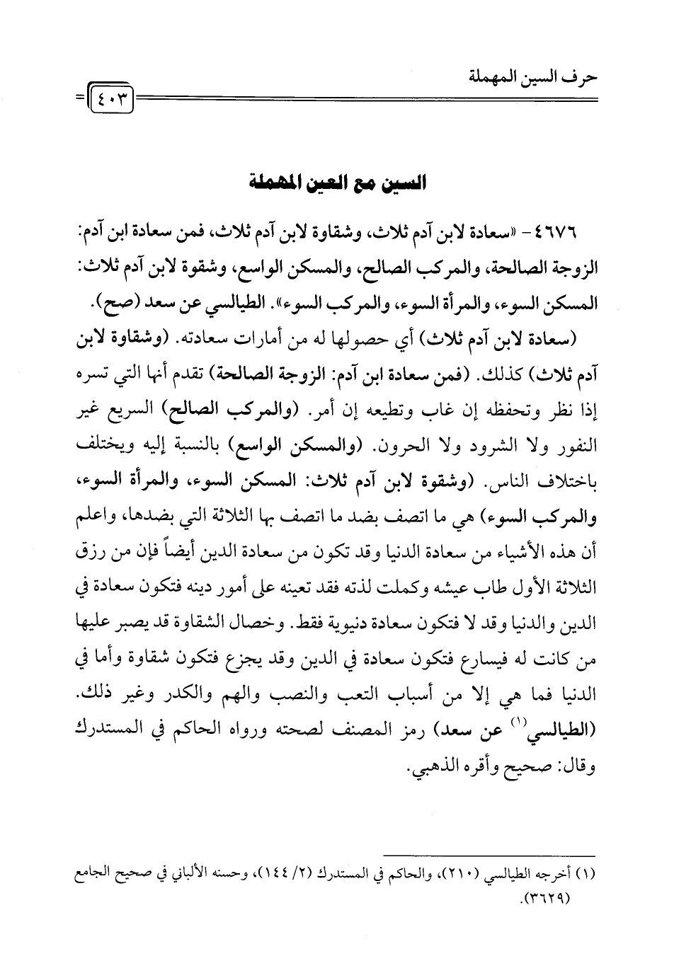 4676 - " سعادة لابن آدم ثلاث وشقاوة لابن آدم ثلاث، فمن سعادة ابن آدم: الزوجة الصالحة، والمركب الصالح، والمسكن الواسع، وشقوة لابن آدم ثلاث: المسكن السوء، والمرأة السوء، والمركب السوء. الطيالسي عن سعد (صح).