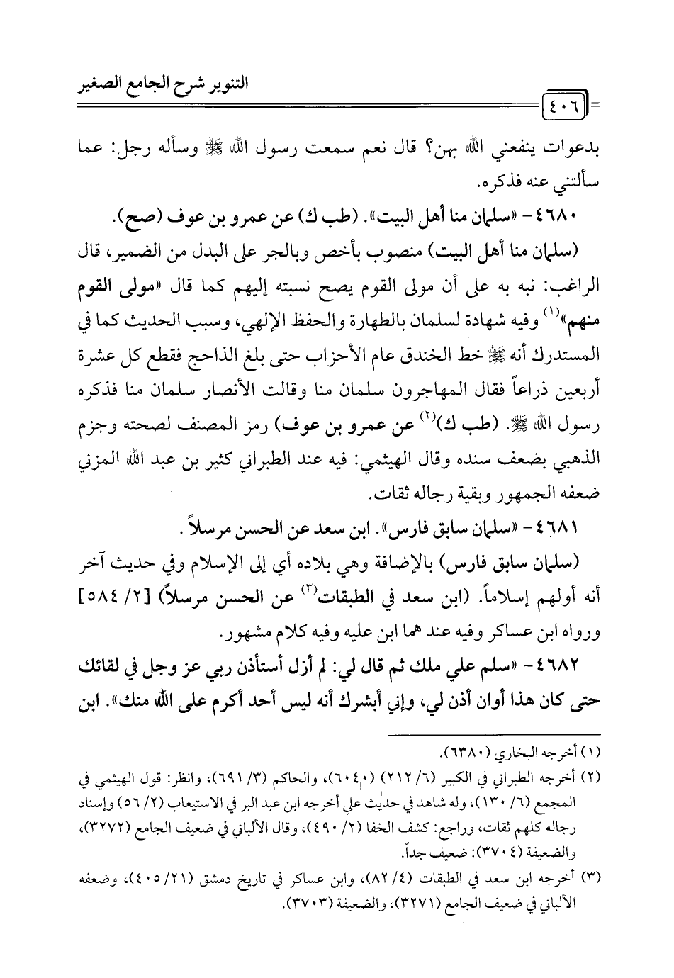 (¬3) أخرجه ابن سعد في الطبقات (4/ 82)، وابن عساكر في تاريخ دمشق (21/ 405)، وضعفه الألباني في ضعيف الجامع (3271)، والضعيفة (3703).