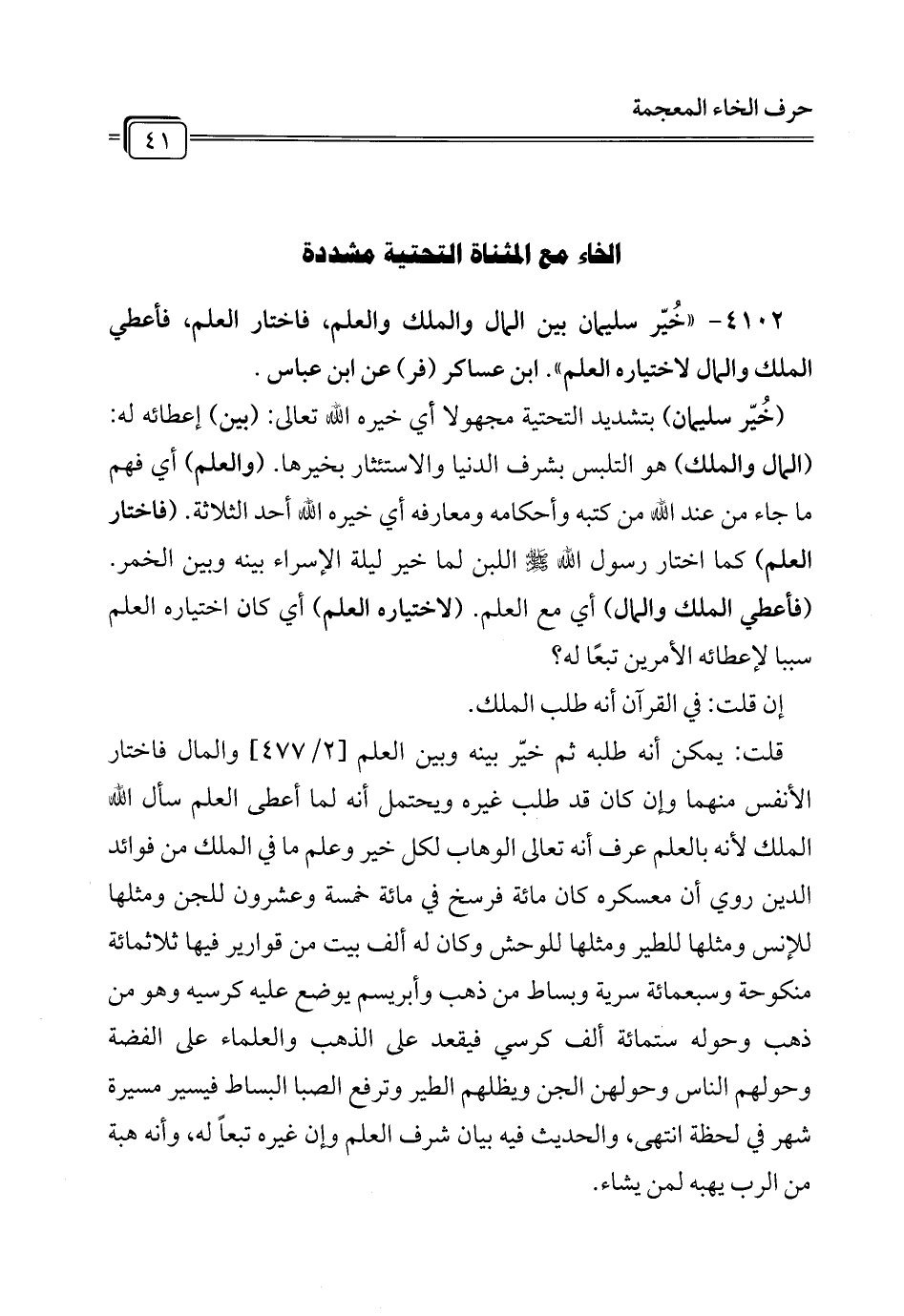 4102 - " خُيّر سليمان بين المال والملك والعلم، فاختار العلم، فأعطي الملك والمال لاختياره العلم". ابن عساكر (فر) عن ابن عباس.