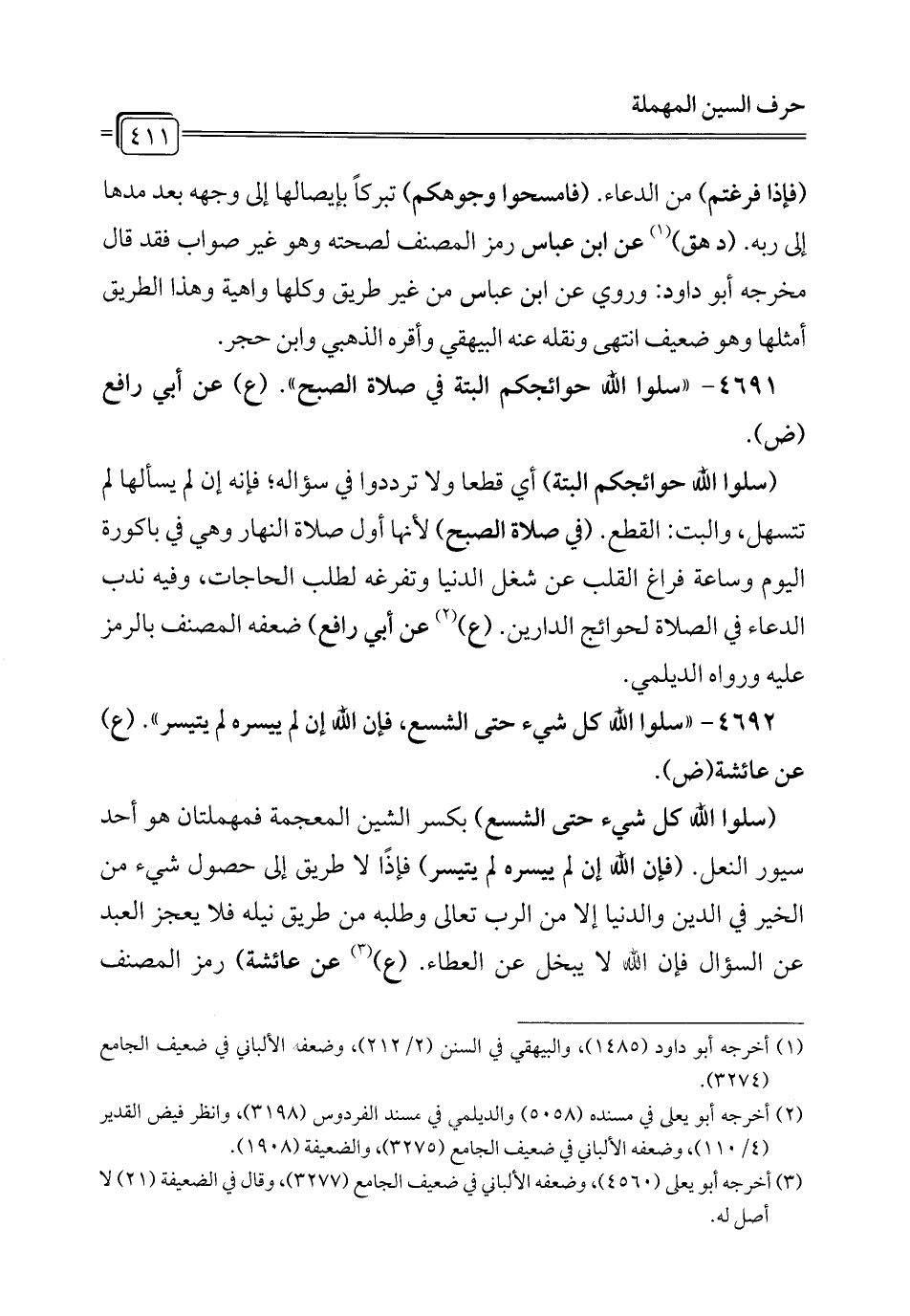(فإذا فرغتم) من الدعاء. (فامسحوا وجوهكم) تبركاً بإيصالها إلى وجهه بعد مدها إلى ربه. (د هق) (¬1) عن ابن عباس رمز المصنف لصحته وهو غير صواب فقد قال مخرجه أبو داود: وروي عن ابن عباس من غير طريق وكلها واهية وهذا الطريق أمثلها وهو ضعيف انتهى ونقله عنه البيهقي وأقره الذهبي وابن حجر.