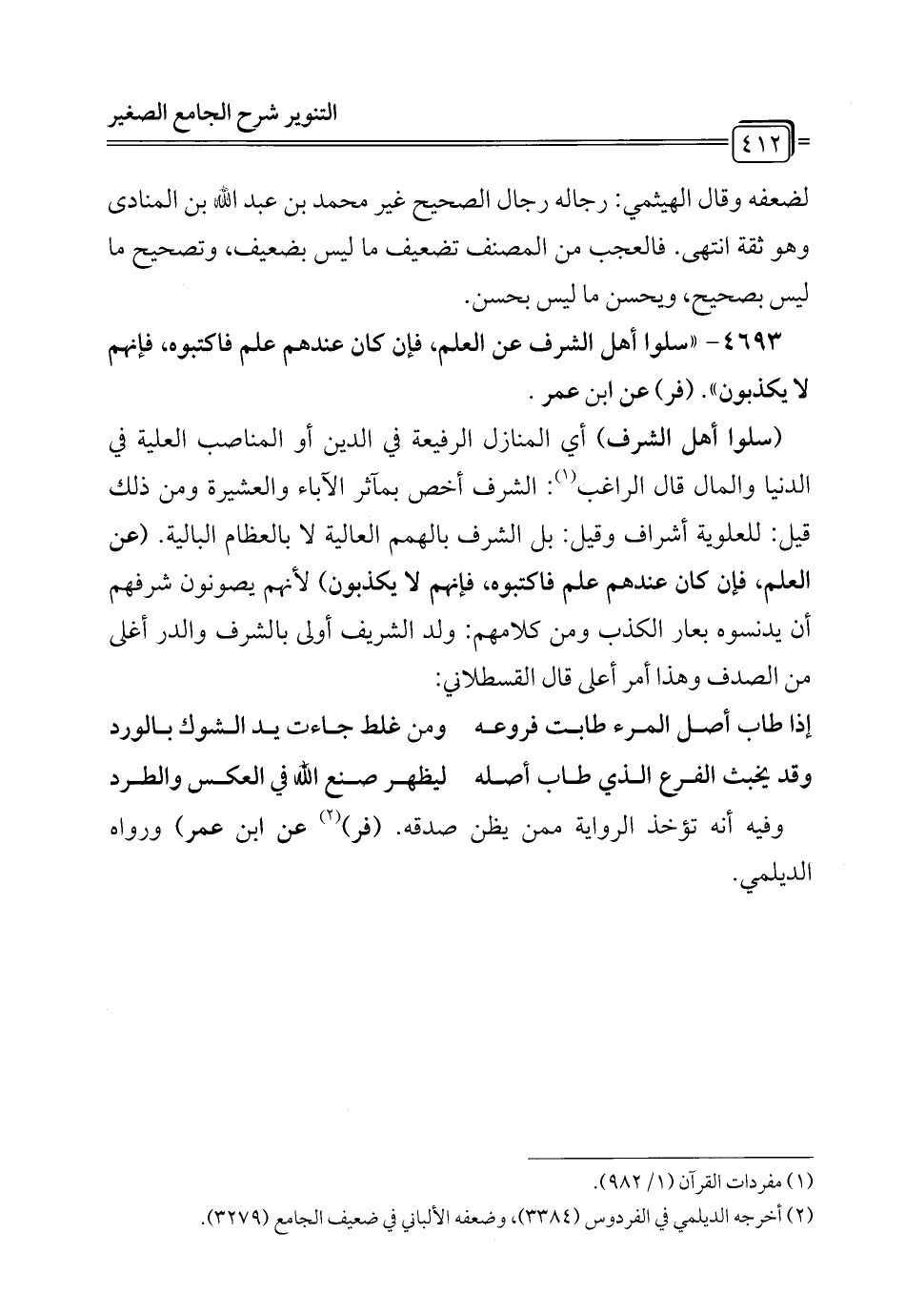 (سلوا أهل الشرف) أي المنازل الرفيعة في الدين أو المناصب العلية في الدنيا والمال قال الراغب (¬1): الشرف أخص بمآثر الآباء والعشيرة ومن ذلك قيل: للعلوية أشراف وقيل: بل الشرف بالهمم العالية لا بالعظام البالية. (عن العلم، فإن كان عندهم علم فاكتبوه، فإنهم لا يكذبون) لأنهم يصونون شرفهم أن يدنسوه بعار الكذب ومن كلامهم: ولد الشريف أولى بالشرف والدر أغلى من الصدف وهذا أمر أعلى قال القسطلاني: