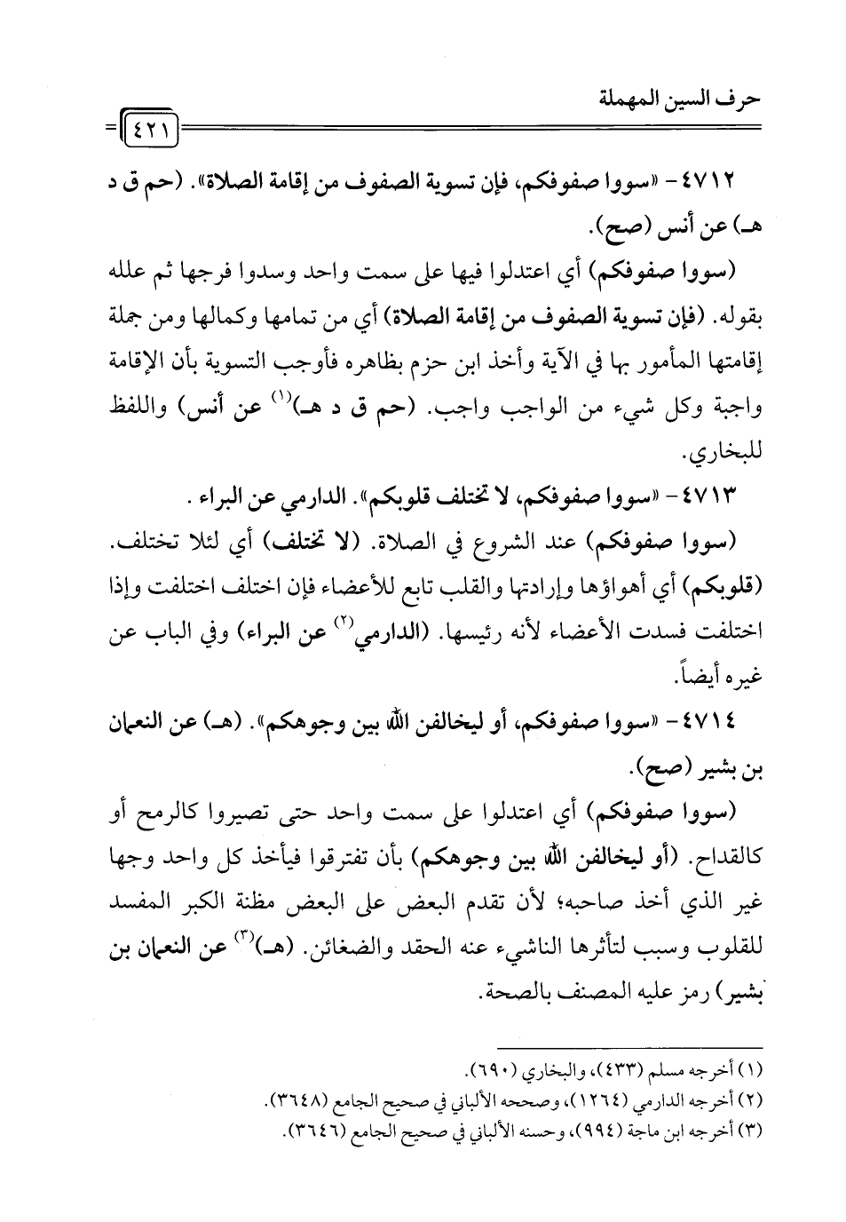 4713 - "سووا صفوفكم، لا تختلف قلوبكم". الدارمي عن البراء.