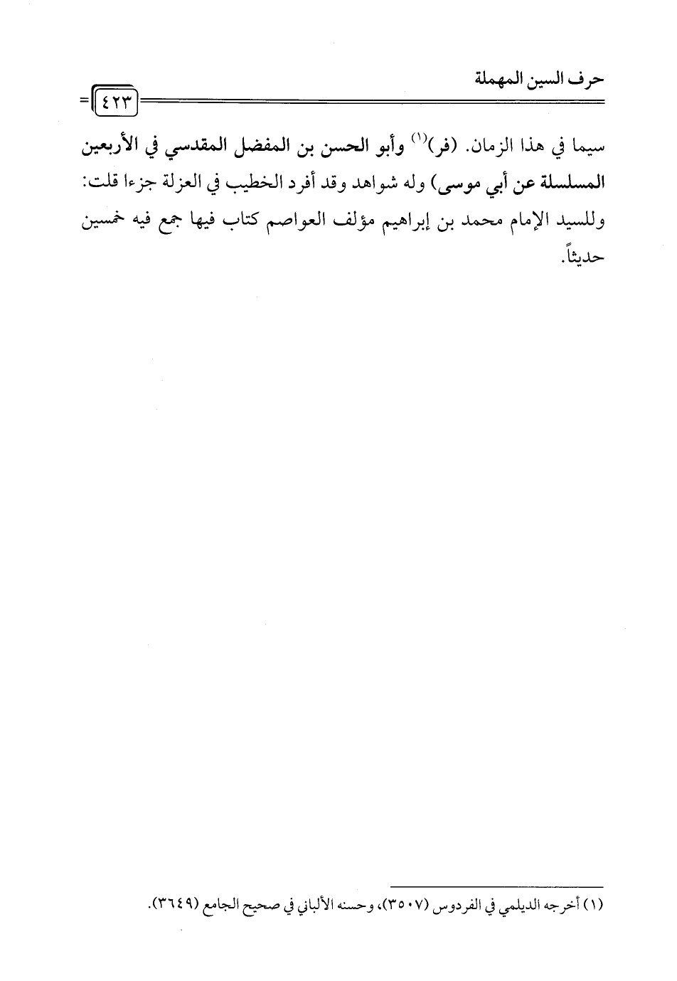 سيما في هذا الزمان. (فر) (¬1) وأبو الحسن بن المفضل المقدسي في الأربعين المسلسلة عن أبي موسى) وله شواهد وقد أفرد الخطيب في العزلة جزءا قلت: وللسيد الإمام محمَّد بن إبراهيم مؤلف العواصم كتاب فيها جمع فيه خمسين حديثاً.