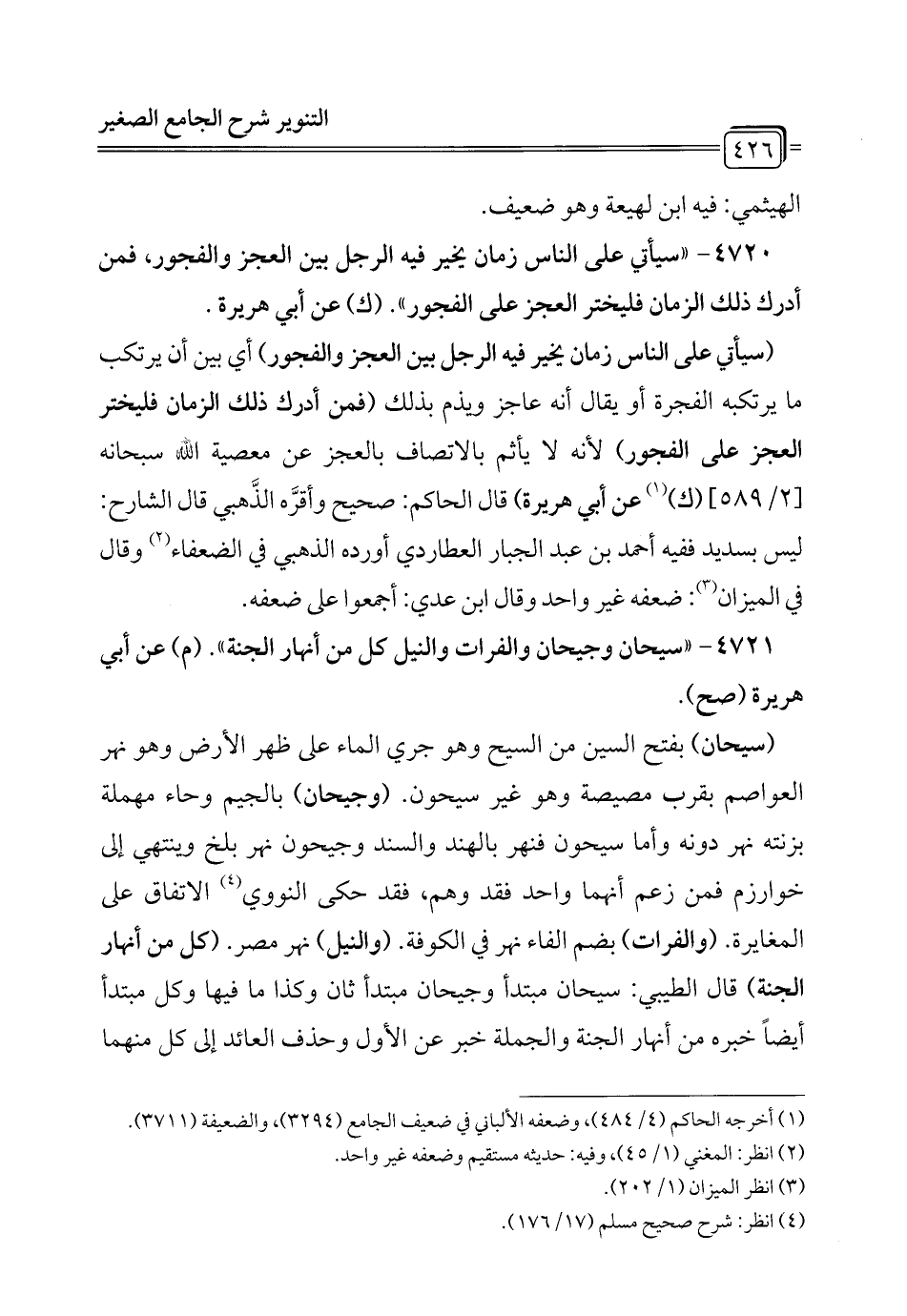 4721 - "سيحان وجيحان والفرات والنيل كل من أنهار الجنة". (م) عن أبي هريرة (صح).
