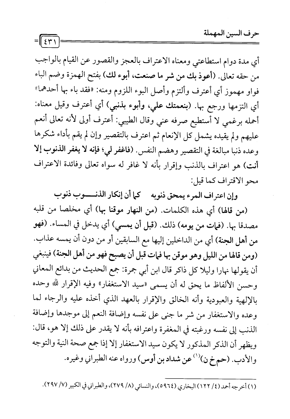 أي مدة دوام استطاعتي ومعناه الاعتراف بالعجز والقصور عن القيام بالواجب من حقه تعالى. (أعوذ بك من شر ما صنعت، أبوء لك) بفتح الهمزة وضم الباء فواو مهموز أي أعترف وألتزم وأصل البوء اللزوم ومنه: "فقد باء بها أحدهما" أي التزمها ورجع بها. (بنعمتك علي، وأبوء بذنبي) أي أعترف وقيل معناه: أحمله برغمي لا أستطيع صرفه عني وقال الطيبي: أعترف أولى لأنه تعالى أنعم عليهم ولم يقيده يشمل كل الإنعام ثم اعترف بالتقصير وإن لم يقم بأداء شكرها وعده ذنبا مبالغة في التقصير وهضم النفس. (فاغفر لي؛ فإنه لا يغفر الذنوب إلا أنت) هو اعتراف بالذنب وإقرار بأنه لا غافر له سواه تعالى وفائدة الاعتراف محو الاقتراف كما قيل: