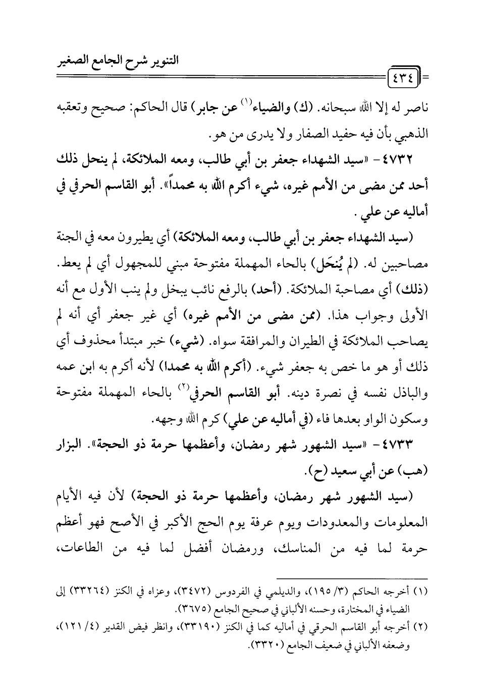 4732 - "سيد الشهداء جعفر بن أبي طالب، ومعه الملائكة، لم ينحل ذلك أحد ممن مضى من الأمم غيره، شيء أكرم الله به محمداً". أبو القاسم الحرفي في أماليه عن علي.