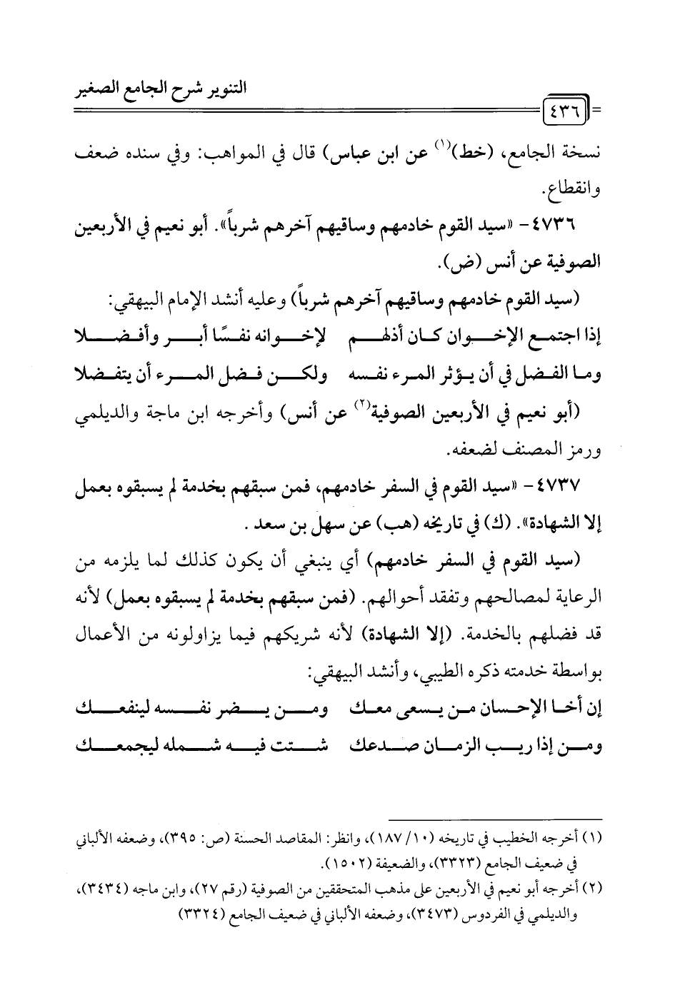 4736 - "سيد القوم خادمهم وساقيهم آخرهم شرباً". أبو نعيم في الأربعين الصوفية عن أنس (ض).