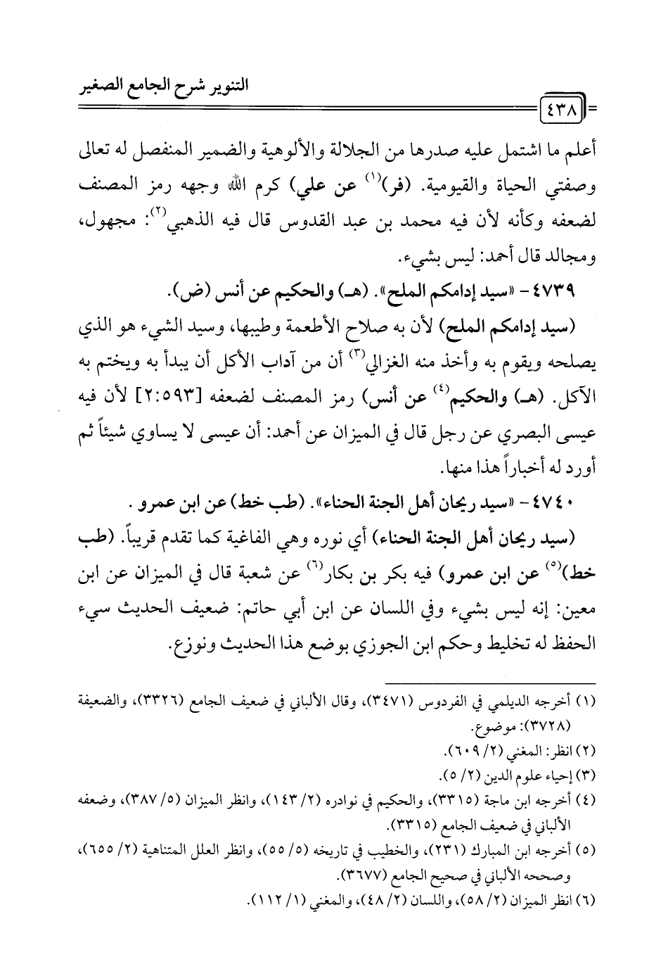 (سيد إدامكم الملح) لأن به صلاح الأطعمة وطيبها، وسيد الشيء هو الذي يصلحه ويقوم به وأخذ منه الغزالي (¬3) أن من آداب الأكل أن يبدأ به ويختم به الآكل. (هـ) والحكيم (¬4) عن أنس) رمز المصنف لضعفه [2: 593] لأن فيه عيسى البصري عن رجل قال في الميزان عن أحمد: أن عيسى لا يساوي شيئاً ثم أورد له أخباراً هذا منها.