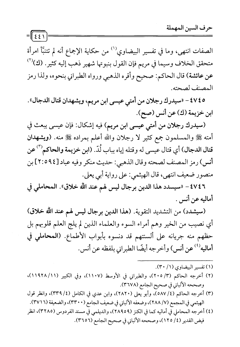 4745 - "سيدرك رجلان من أمتي عيسى ابن مريم، ويشهدان قتال الدجال". ابن خزيمة (ك) عن أنس (صح).