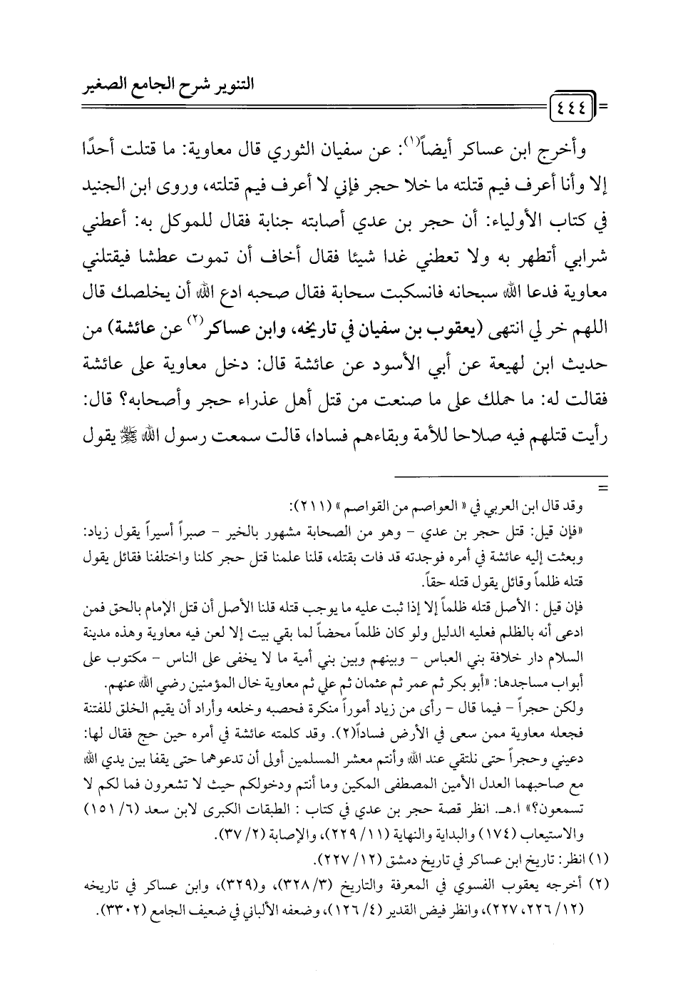 فإن قيل: الأصل قتله ظلماً إلا إذا ثبت عليه ما يوجب قتله قلنا الأصل أن قتل الإِمام بالحق فمن ادعى أنه بالظلم فعليه الدليل ولو كان ظلماً محضاً لما بقي بيت إلا لعن فيه معاوية وهذه مدينة السلام دار خلافة بني العباس -وبينهم وبين بني أمية ما لا يخفى على الناس- مكتوب على أبواب مساجدها: "أبو بكر ثم عمر ثم عثمان ثم علي ثم معاوية خال المؤمنين رضي الله عنهم. ولكن حجراً -فيما قال- رأى من زياد أموراً منكرة فحصبه وخلعه وأراد أن يقيم الخلق للفتنة فجعله معاوية ممن سعى في الأرض فساداً (2). وقد كلمته عائشة في أمره حين حج فقال لها: دعيني وحجراً حتى نلتقي عند الله وأنتم معشر المسلمين أولى أن تدعوهما حتى يقفا بين يدي الله مع صاحبهما العدل الأمين المصطفى المكين وما أنتم ودخولكم حيث لا تشعرون فما لكم لا تسمعون؟ " ا. هـ انظر قصة حجر بن عدي في كتاب: الطبقات الكبرى لابن سعد (6/ 151) والاستيعاب (174) والبداية والنهاية (11/ 229)، والإصابة (2/ 37).