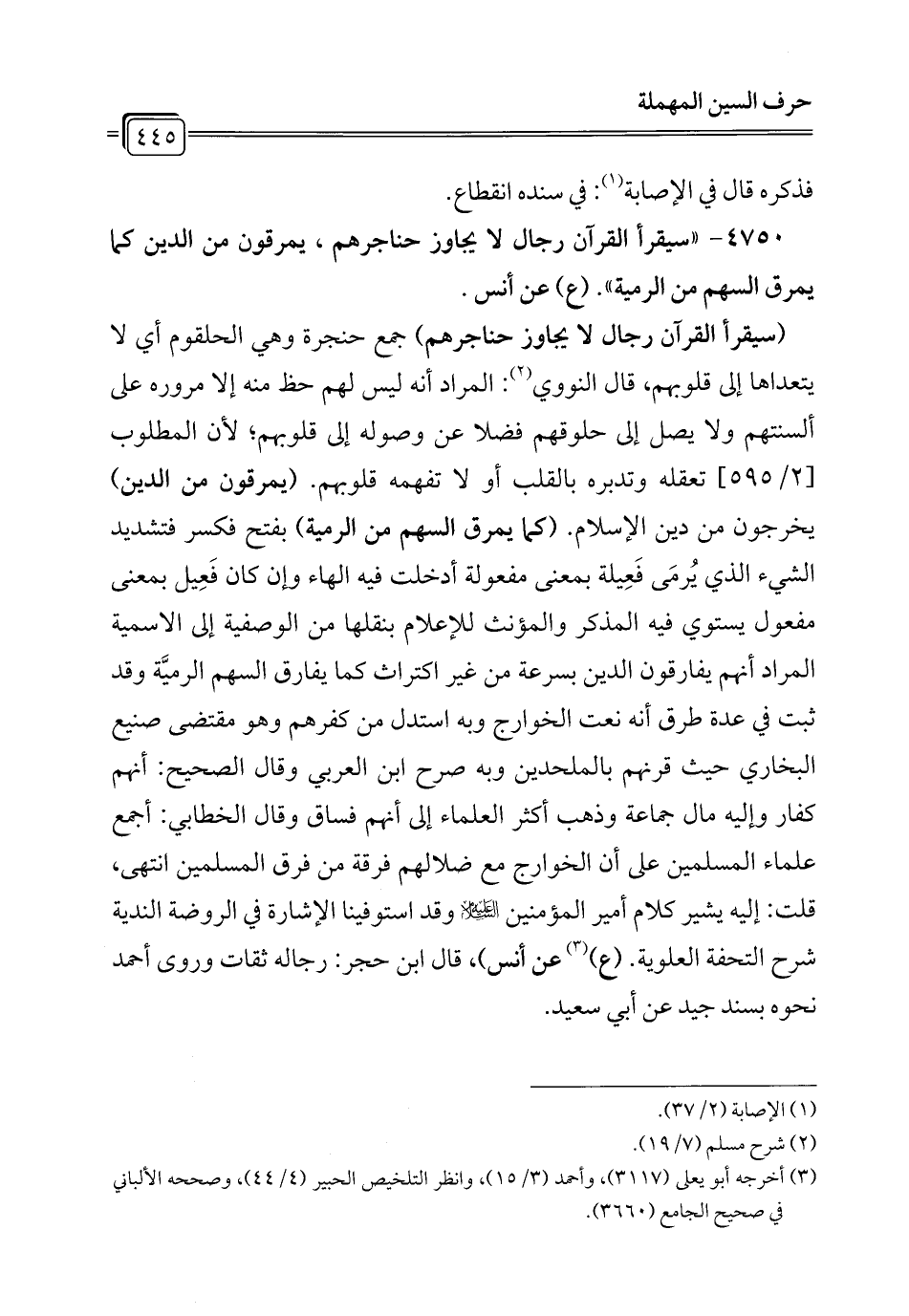 (سيقرأ القرآن رجال لا يجاوز حناجرهم) جمع حنجرة وهي الحلقوم أي لا يتعداها إلى قلوبهم، قال النووي (¬2): المراد أنه ليس لهم حظ منه إلا مروره على ألسنتهم ولا يصل إلى حلوقهم فضلا عن وصوله إلى قلوبهم؛ لأن المطلوب [2/ 595] تعقله وتدبره بالقلب أو لا تفهمه قلوبهم. (يمرقون من الدين) يخرجون من دين الإِسلام. (كما يمرق السهم من الرمية) بفتح فكسر فتشديد الشيء الذي يُرمَى فَعِيلة بمعنى مفعولة أدخلت فيه الهاء وإن كان فَعِيل بمعنى مفعول يستوي فيه المذكر والمؤنث للإعلام بنقلها من الوصفية إلى الاسمية المراد أنهم يفارقون الدين بسرعة من غير اكتراث كما يفارق السهم الرميَّة وقد ثبت في عدة طرق أنه نعت الخوارج وبه استدل من كفرهم وهو مقتضى صنيع البخاري حيث قرنهم بالملحدين وبه صرح ابن العربي وقال الصحيح: أنهم كفار وإليه مال جماعة وذهب أكثر العلماء إلى أنهم فساق وقال الخطابي: أجمع علماء المسلمين على أن الخوارج مع ضلالهم فرقة من فرق المسلمين انتهى، قلت: إليه يشير كلام أمير المؤمنين -عَلَيْهِ اْلسَّلاَمْ- وقد استوفينا الإشارة في الروضة الندية شرح التحفة العلوية. (ع) (¬3) عن أنس)، قال ابن حجر: رجاله ثقات وروى أحمد نحوه بسند جيد عن أبي سعيد.