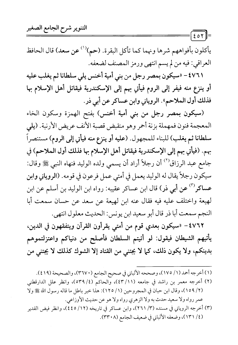 4761 - "سيكون بمصر رجل من بني أمية أخنس يلي سلطانا ثم يغلب عليه أو ينزع منه فيفر إلى الروم فيأتي بهم إلى الإسكندرية فيقاتل أهل الإِسلام بها فذلك أول الملاحم". الروياني وابن عساكر عن أبي ذر.