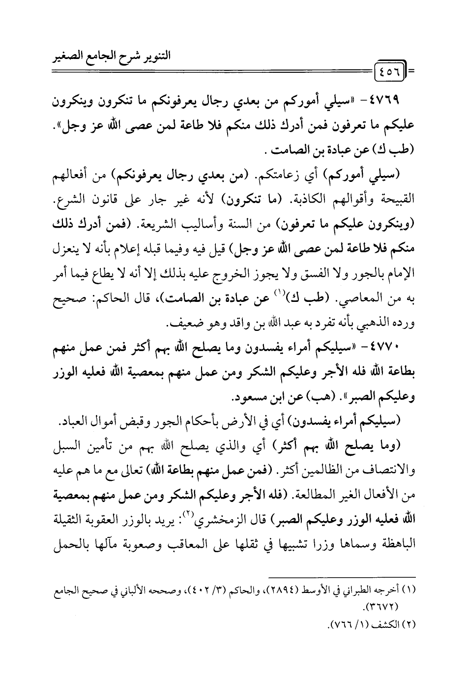 4770 - "سيليكم أمراء يفسدون وما يصلح الله يهم أكثر فمن عمل منهم بطاعة الله فله الأجر وعليكم الشكر ومن عمل منهم بمعصية الله فعليه الوزر وعليكم الصبر". (هب) عن ابن مسعود.