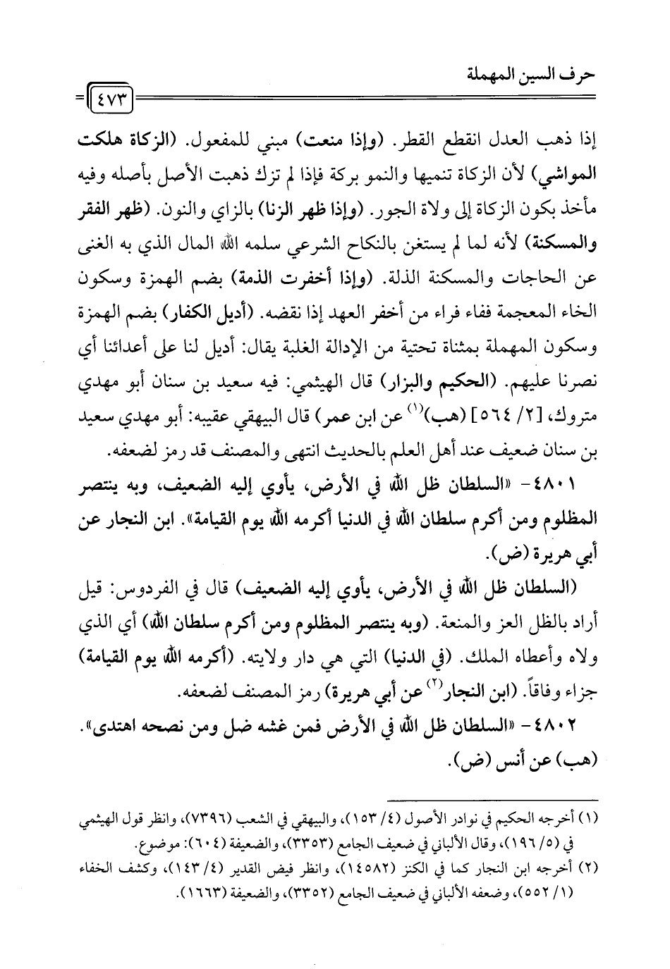 4801 - "السلطان ظل الله في الأرض، يأوي إليه الضعيف، وبه ينتصر المظلوم ومن أكرم سلطان الله في الدنيا أكرمه الله يوم القيامة". ابن النجار عن أبي هريرة (ض).