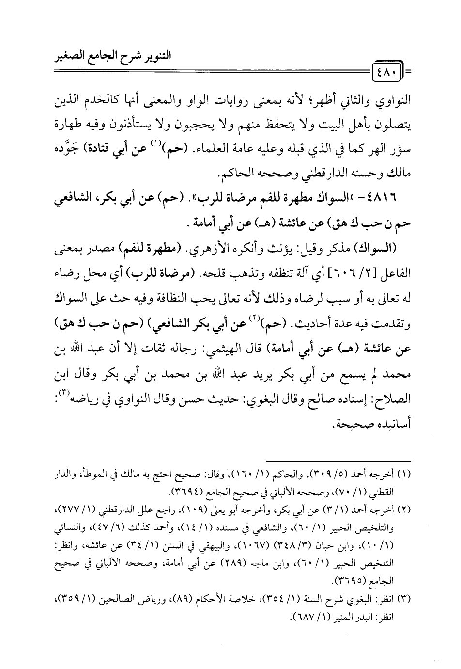 4816 - "السواك مطهرة للفم مرضاة للرب". (حم) عن أبي بكر، الشافعي حم ن حب ك هق) عن عائشة (هـ) عن أبي أمامة.