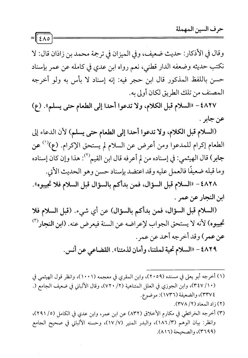 4828 - "السلام قبل السؤال، فمن بدأكم بالسؤال قبل السلام فلا تجيبوه". ابن النجار عن عمر.