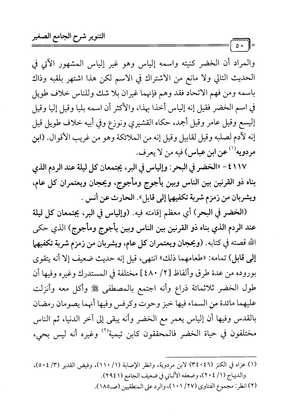 4117 - "الخضر في البحر: وإلياس في البر، يجتمعان كل ليلة عند الردم الذي بناه ذو القرنين بين الناس وبين يأجوج ومأجوج، ويحجان ويعتمران كل عام، ويشربان من زمزم شربة تكفيهما إلى قابل". الحارث عن أنس.