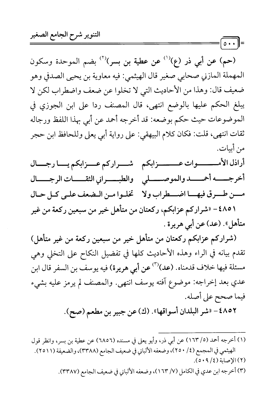 (¬1) أخرجه أحمد (5/ 163) عن أبي ذر، وأيو يعلى في مسنده (6856) عن عطية بن بسر، وانظر قول الهيثمي في المجمع (4/ 250)، وضعفه الألباني في ضعيف الجامع (3388)، والضعيفة (2511).