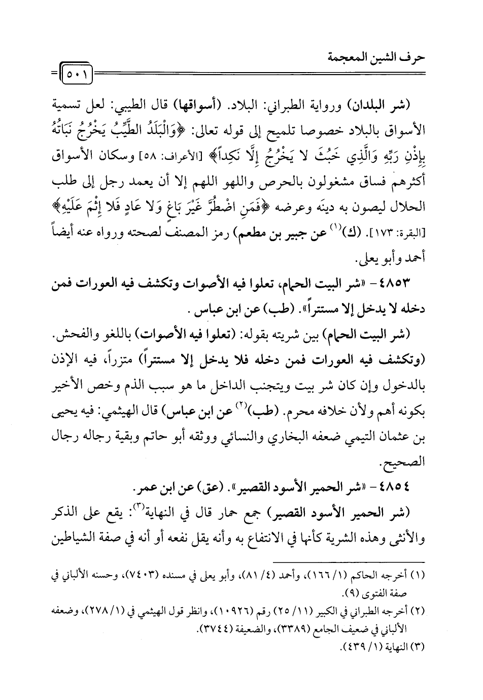 (شر البلدان) ورواية الطبراني: البلاد. (أسواقها) قال الطيبي: لعل تسمية الأسواق بالبلاد خصوصا تلميح إلى قوله تعالى: {وَالْبَلَدُ الطَّيِّبُ يَخْرُجُ نَبَاتُهُ بِإِذْنِ رَبِّهِ وَالَّذِي خَبُثَ لَا يَخْرُجُ إِلَّا نَكِدًا} [الأعراف 58] وسكان الأسواق أكثرهم فساق مشغولون بالحرص واللهو اللهم إلا أن يعمد رجل إلى طلب الحلال ليصون به دينَه وعرضه {فَمَنِ اضْطُرَّ غَيْرَ بَاغٍ وَلَا عَادٍ فَلَا إِثْمَ عَلَيْهِ} [البقرة: 173]. (ك) (¬1) عن جبير بن مطعم) رمز المصنف لصحته ورواه عنه أيضاً أحمد وأبو يعلى.