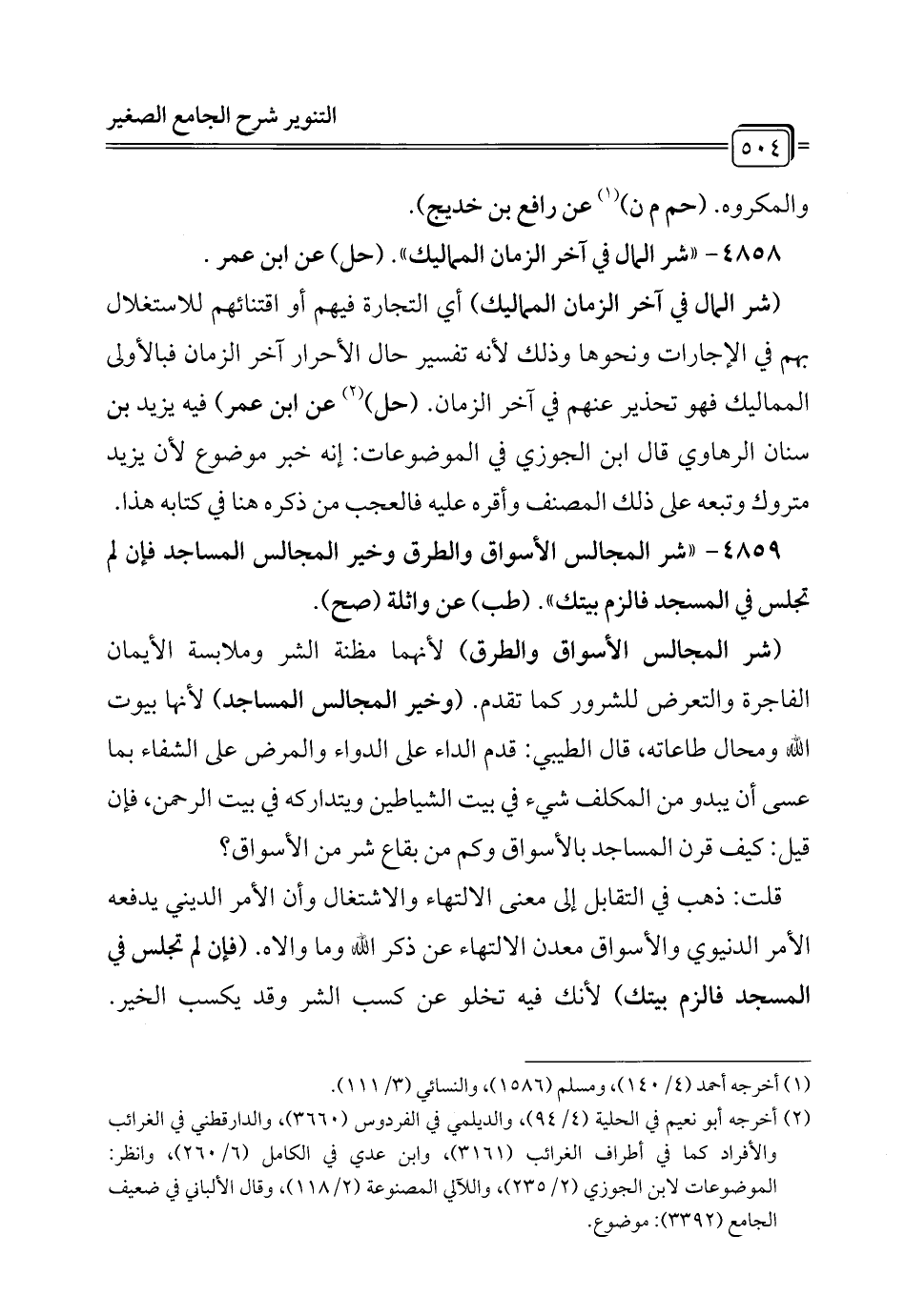 (شر المال في آخر الزمان المماليك) أي التجارة فيهم أو اقتنائهم للاستغلال بهم في الإجارات ونحوها وذلك لأنه تفسير حال الأحرار آخر الزمان فبالأولى المماليك فهو تحذير عنهم في آخر الزمان. (حل) (¬2) عن ابن عمر) فيه يزيد بن سنان الرهاوي قال ابن الجوزي في الموضوعات: إنه خبر موضوع لأن يزيد متروك وتبعه على ذلك المصنف وأقره عليه فالعجب من ذكره هنا في كتابه هذا.