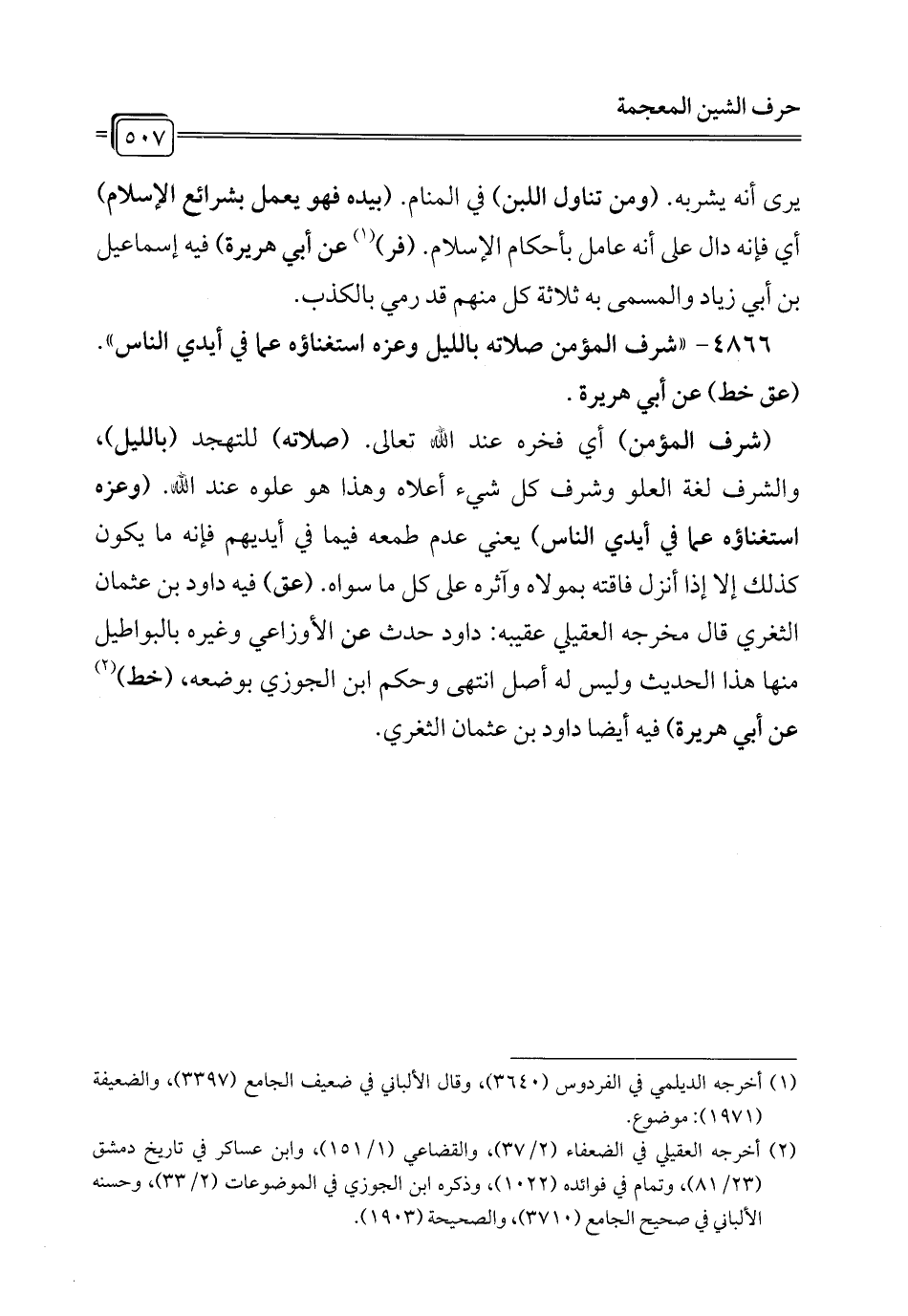 4866 - "شرف المؤمن صلاته بالليل وعزه استغناؤه عما في أيدي الناس". (عق خط) عن أبي هريرة.