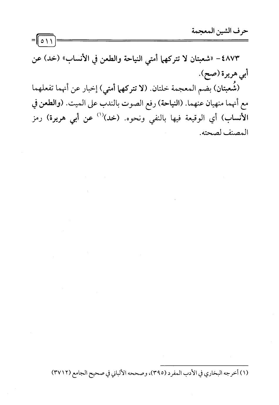 4873 - "شعبتان لا تتركهما أمتي النياحة والطعن في الأنساب" (خد) عن أبي هريرة (صح).