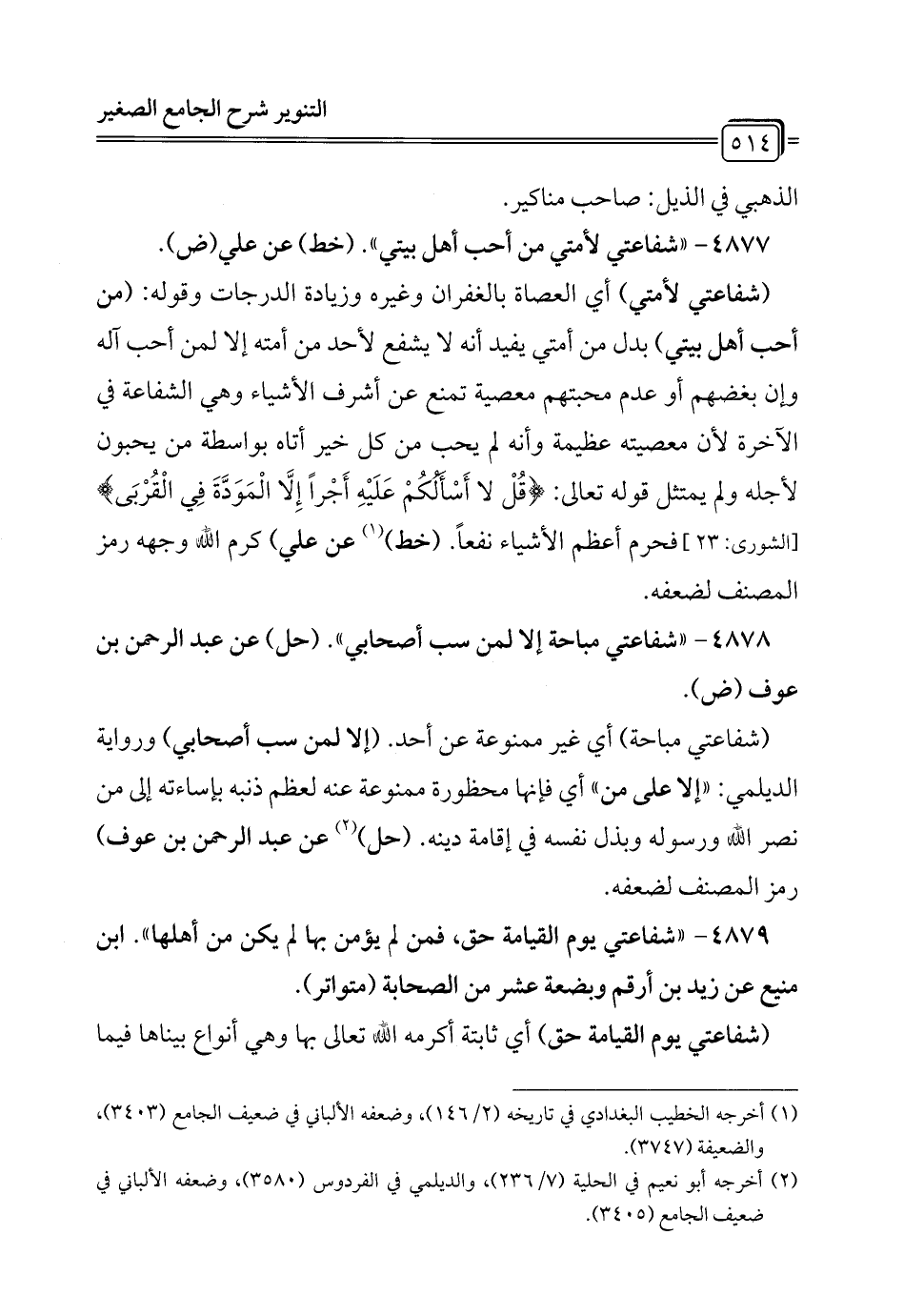 4879 - "شفاعتي يوم القيامة حق، فمن لم يؤمن بها لم يكن من أهلها". ابن منيع عن زيد بن أرقم وبضعة عشر من الصحابة (متواتر).