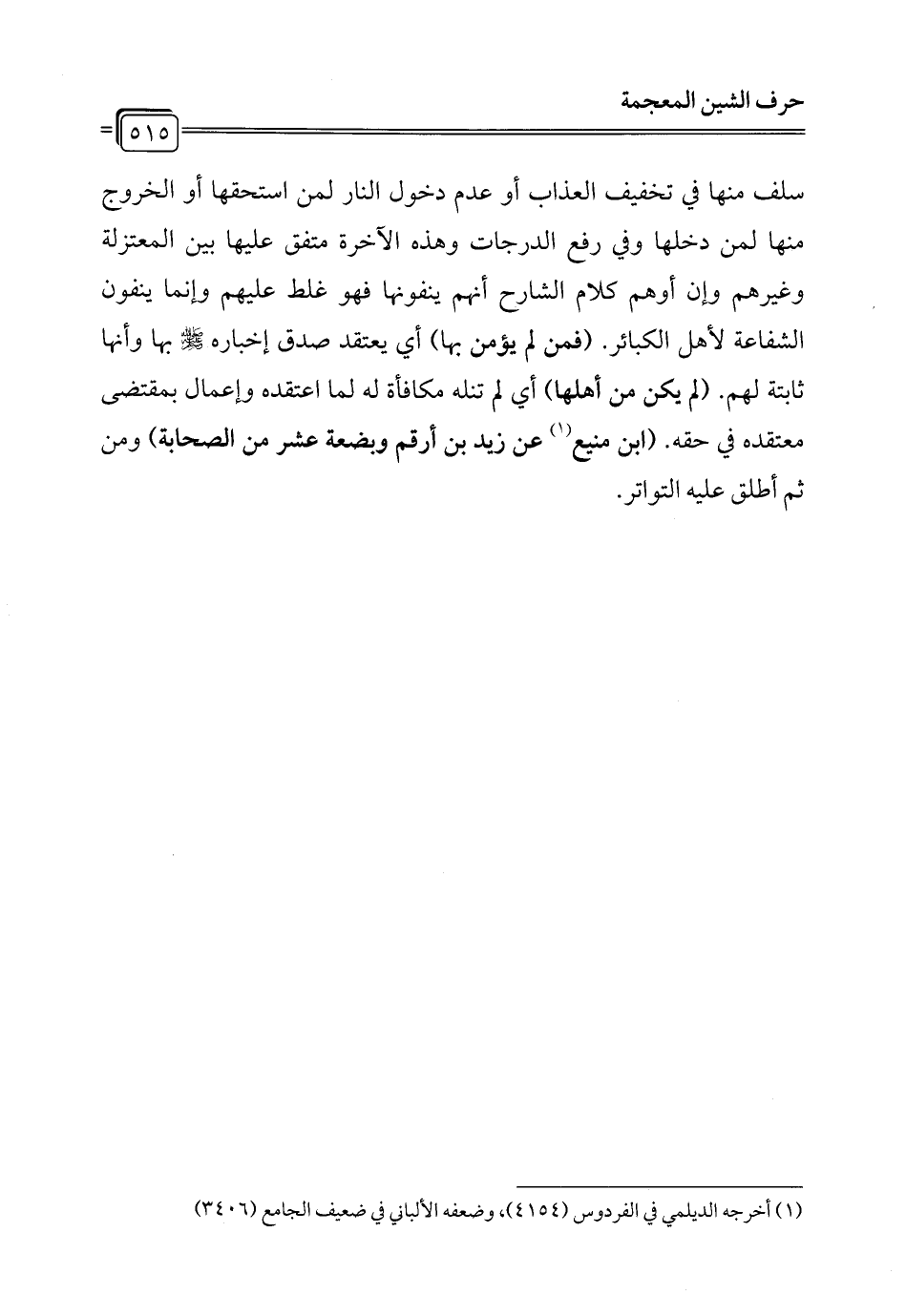سلف منها في تخفيف العذاب أو عدم دخول النار لمن استحقها أو الخروج منها لمن دخلها وفي رفع الدرجات وهذه الآخرة متفق عليها بين المعتزلة وغيرهم وإن أوهم كلام الشارح أنهم ينفونها فهو غلط عليهم وإنما ينفون الشفاعة لأهل الكبائر. (فمن لم يؤمن بها) أي يعتقد صدق إخباره - صلى الله عليه وسلم - بها وأنها ثابتة لهم. (لم يكن من أهلها) أي لم تنله مكافأة له لما اعتقده وإعمال بمقتضى معتقده في حقه. (ابن منيع (¬1) عن زيد بن أرقم وبضعة عشر من الصحابة) ومن ثم أطلق عليه التواتر.
