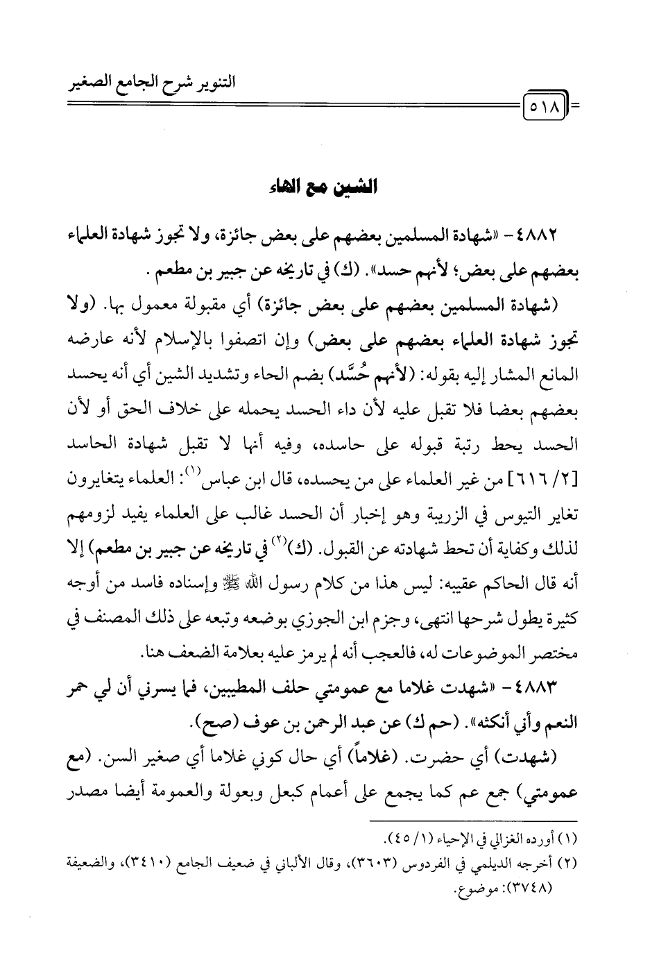 (شهادة المسلمين بعضهم على بعض جائزة) أي مقبولة معمول بها. (ولا تجوز شهادة العلماء بعضهم على بعض) وإن اتصفوا بالإِسلام لأنه عارضه المانع المشار إليه بقوله: (لأنهم حُسَّد) بضم الحاء وتشديد الشين أي أنه يحسد بعضهم بعضا فلا تقبل عليه لأن داء الحسد يحمله على خلاف الحق أو لأن الحسد يحط رتبة قبوله على حاسده، وفيه أنها لا تقبل شهادة الحاسد [2/ 616] من غير العلماء على من يحسده، قال ابن عباس (¬1): العلماء يتغايرون تغاير التيوس في الزريبة وهو إخبار أن الحسد غالب على العلماء يفيد لزومهم لذلك وكفاية أن تحط شهادته عن القبول. (ك) (¬2) في تاريخه عن جبير بن مطعم) إلا أنه قال الحاكم عقيبه: ليس هذا من كلام رسول الله - صلى الله عليه وسلم - وإسناده فاسد من أوجه كتيرة يطول شرحها انتهى، وجزم ابن الجوزي بوضعه وتبعه على ذلك المصنف في مختصر الموضوعات له، فالعجب أنه لم يرمز عليه بعلامة الضعف هنا.