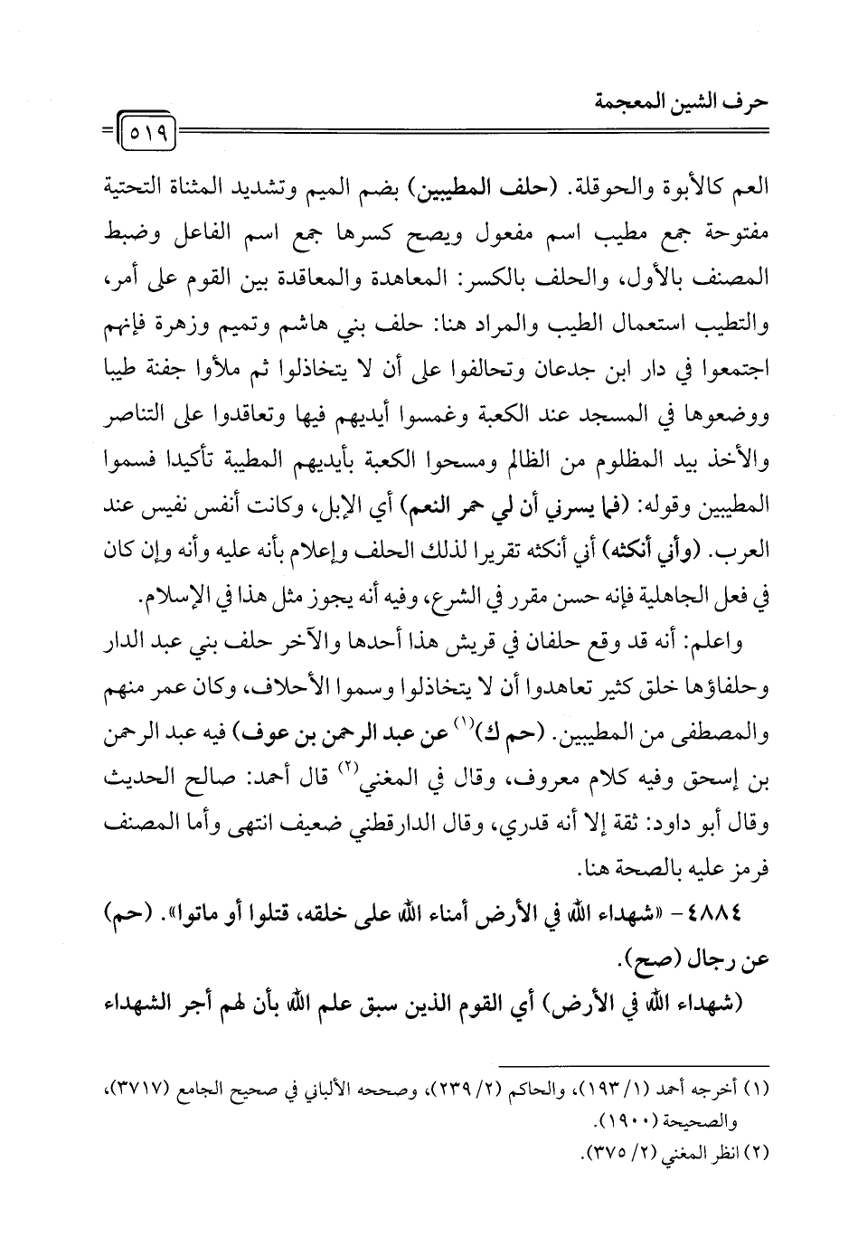 العم كالأبوة والحوقلة. (حلف المطيبين) بضم الميم وتشديد المثناة التحتية مفتوحة جمع مطيب اسم مفعول ويصح كسرها جمع اسم الفاعل وضبط المصنف بالأول، والحلف بالكسر: المعاهدة والمعاقدة بين القوم على أمر، والتطيب استعمال الطيب والمراد هنا: حلف بني هاشم وتميم وزهرة فإنهم اجتمعوا في دار ابن جدعان وتحالفوا على أن لا يتخاذلوا ثم ملأوا جفنة طيبا ووضعوها في المسجد عند الكعبة وغمسوا أيديهم فيها وتعاقدوا على التناصر والأخذ بيد المظلوم من الظالم ومسحوا الكعبة بأيديهم المطيبة تأكيدا فسموا المطيبين وقوله: (فما يسرني أن لي حمر النعم) أي الإبل، وكانت أنفس نفيس عند العرب. (وأني أنكثه) أني أنكثه تقريرا لذلك الحلف وإعلام بأنه عليه وأنه وإن كان في فعل الجاهلية فإنه حسن مقرر في الشرع، وفيه أنه يجوز مثل هذا في الإسلام.