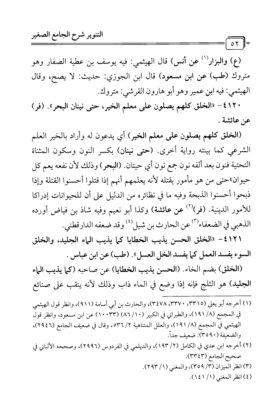 4120 - "الخلق كلهم يصلون على معلم الخير، حتى نينان البحر". (فر) عن عائشة.