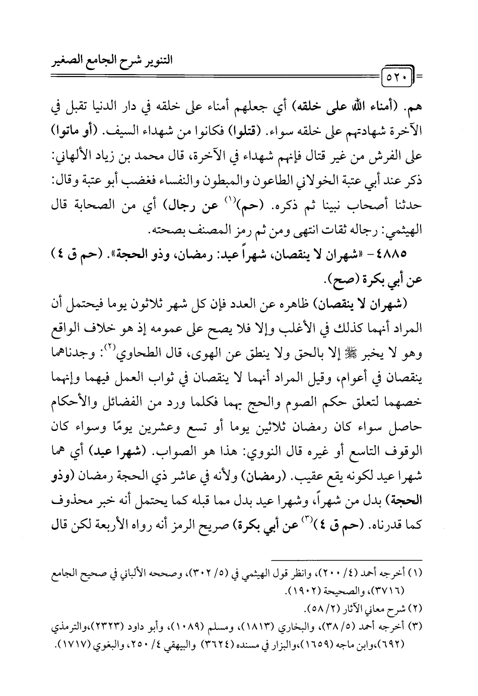 4885 - "شهران لا ينقصان، شهراً عيد: رمضان، وذو الحجة". (حم ق 4) عن أبي بكرة (صح).