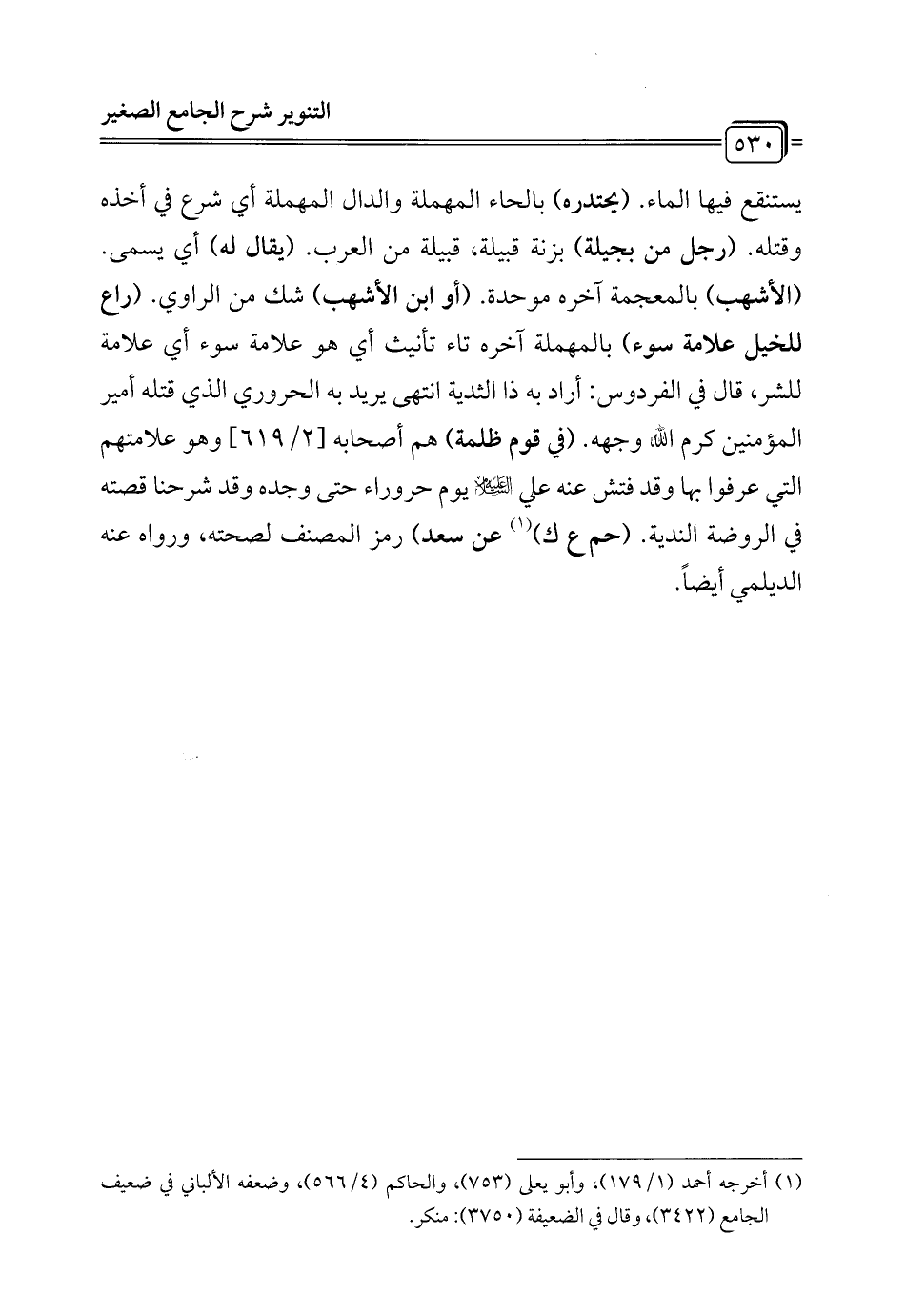 يستنقع فيها الماء. (يحتدره) بالحاء المهملة والدال المهملة أي شرع في أخذه وقتله. (رجل من بجيلة) بزنة قبيلة، قبيلة من العرب. (يقال له) أي يسمى. (الأشهب) بالمعجمة آخره موحدة. (أو ابن الأشهب) شك من الراوي. (راع للخيل علامة سوء) بالمهملة آخره تاء تأنيث أي هو علامة سوء أي علامة للشر، قال في الفردوس: أراد به ذا الثدية انتهى يريد به الحروري الذي قتله أمير المؤمنين كرم الله وجهه. (في قوم ظلمة) هم أصحابه [2/ 619] وهو علامتهم التي عرفوا بها وقد فتش عنه علي -عَلَيْهِ اْلسَّلاَمْ- يوم حروراء حتى وجده وقد شرحنا قصته في الروضة الندية. (حم ع ك) (¬1) عن سعد" رمز المصنف لصحته، ورواه عنه الديلمي أيضاً.