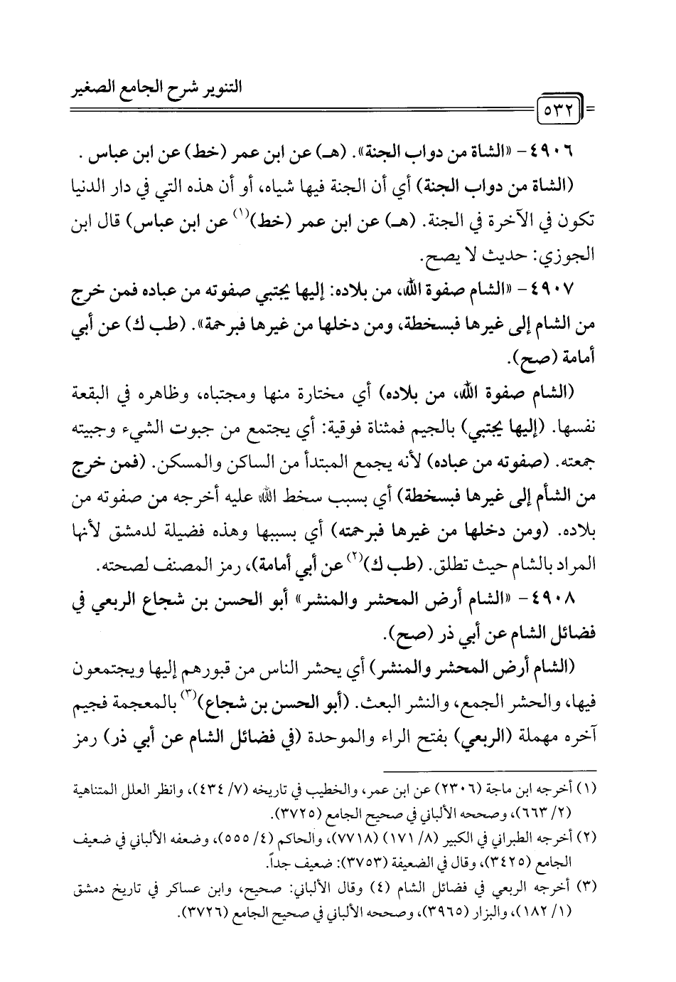 4908 - "الشام أرض المحشر والمنشر" أبو الحسن بن شجاع الربعي في فضائل الشام عن أبي ذر (صح).