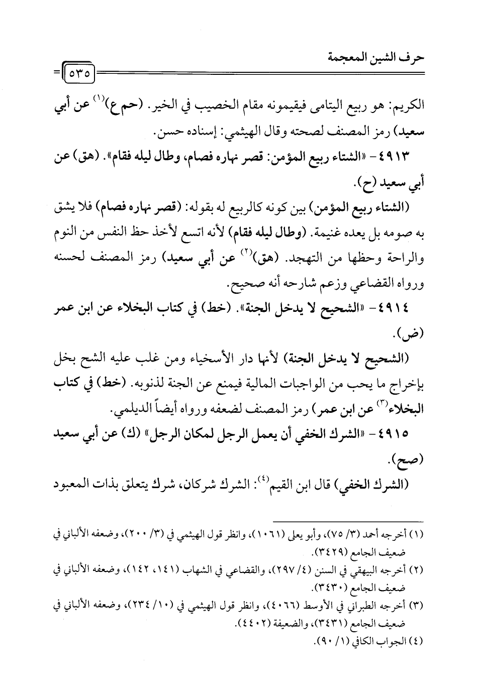 4913 - "الشتاء ربيع المؤمن: قصر نهاره فصام، وطال ليله فقام". (هق) عن أبي سعيد (ح).