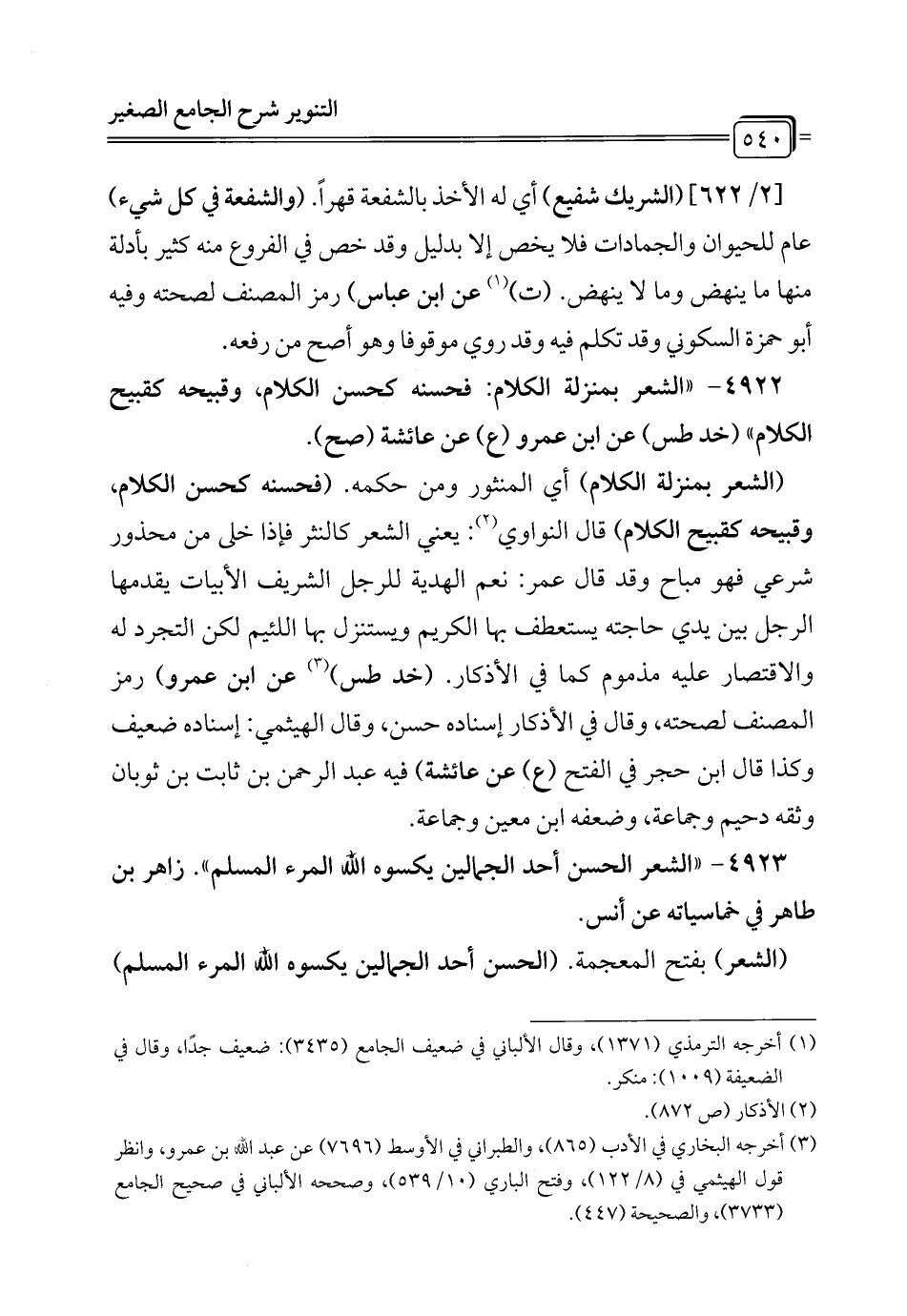 (الشعر بمنزلة الكلام) أي المنثور ومن حكمه. (فحسنه كحسن الكلام، وقبيحه كقبيح الكلام) قال النواوي (¬2): يعني الشعر كالنثر فإذا خلى من محذور شرعي فهو مباح وقد قال عمر: نعم الهدية للرجل الشريف الأبيات يقدمها الرجل بين يدي حاجته يستعطف بها الكريم ويستنزل بها اللئيم لكن التجرد له والاقتصار عليه مذموم كما في الأذكار. (خد طس) (¬3) عن ابن عمرو) رمز المصنف لصحته، وقال في الأذكار إسناده حسن، وقال الهيثمي: إسناده ضعيف وكذا قال ابن حجر في الفتح (ع) عن عائشة) فيه عبد الرحمن بن ثابت بن ثوبان وثقه دحيم وجماعة، وضعفه ابن معين وجماعة.