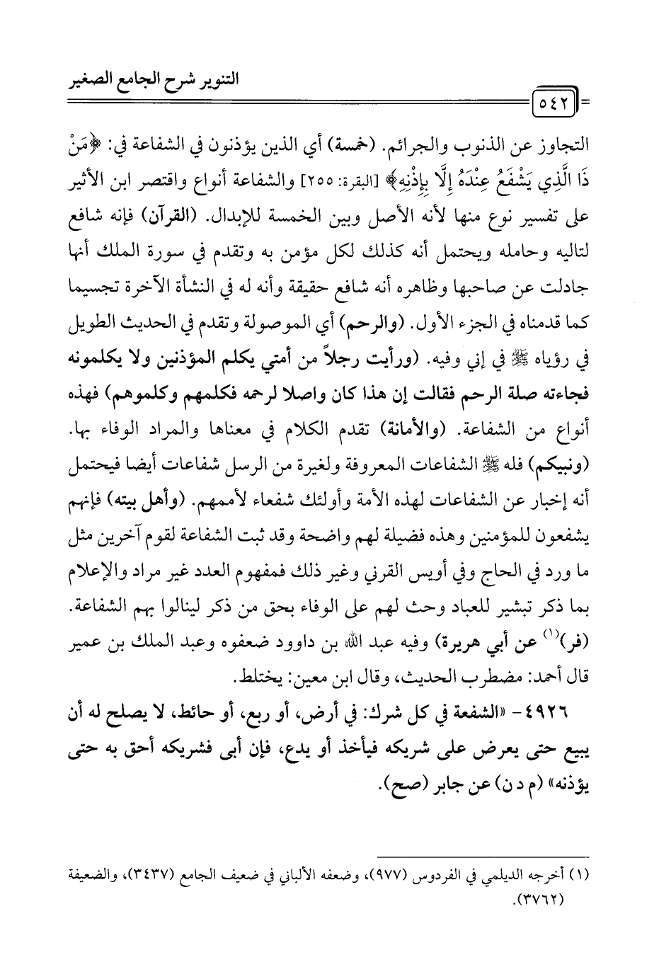 التجاوز عن الذنوب والجرائم. (خمسة) أي الذين يؤذنون في الشفاعة في: {مَنْ ذَا الَّذِي يَشْفَعُ عِنْدَهُ إِلَّا بِإِذْنِهِ} [البقرة: 255] والشفاعة أنواع واقتصر ابن الأثير على تفسير نوع منها لأنه الأصل وبين الخمسة للإبدال. (القرآن) فإنه شافع لتاليه وحامله ويحتمل أنه كذلك لكل مؤمن به وتقدم في سورة الملك أنها جادلت عن صاحبها وظاهره أنه شافع حقيقة وأنه له في النشأة الآخرة تجسيما كما قدمناه في الجزء الأول. (والرحم) أي الموصولة وتقدم في الحديث الطويل في رؤياه - صلى الله عليه وسلم - في إني وفيه. (ورأيت رجلاً من أمتي يكلم المؤذنين ولا يكلمونه فجاءته صلة الرحم فقالت إن هذا كان واصلا لرحمه فكلمهم وكلموهم) فهذه أنواع من الشفاعة. (والأمانة) تقدم الكلام في معناها والمراد الوفاء بها. (ونبيكم) فله - صلى الله عليه وسلم - الشفاعات المعروفة ولغيره من الرسل شفاعات أيضاً فيحتمل أنه إخبار عن الشفاعات لهذه الأمة وأولئك شفعاء لأممهم. (وأهل بيته) فإنهم يشفعون للمؤمنين وهذه فضيلة لهم واضحة وقد ثبت الشفاعة لقوم آخرين مثل ما ورد في الحاج وفي أويس القرني وغير ذلك فمفهوم العدد غير مراد والإعلام بما ذكر تبشير للعباد وحث لهم على الوفاء بحق من ذكر لينالوا بهم الشفاعة. (فر) (¬1) عن أبي هريرة) وفيه عبد الله بن داوود ضعفوه وعبد الملك بن عمير قال أحمد: مضطرب الحديث، وقال ابن معين: يختلط.