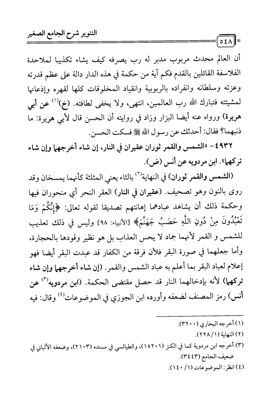 4932 - "الشمس والقمر ثوران عقيران في النار، إن شاء أخرجهما وإن شاء تركهما". ابن مردويه عن أنس (ض).
