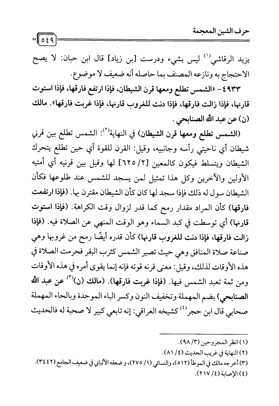 4933 - "الشمس تطلع ومعها قرن الشيطان، فإذا ارتفع فارقها، فإذا استوت قارنها، فإذا زالت فارقها، فإذا دنت للغروب قارنها، فإذا غربت فارقها". مالك (ن) عن عبد الله الصنابحي.
