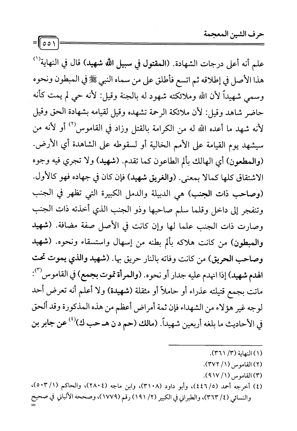 علم أنه أعلى درجات الشهادة. (المقتول في سبيل الله شهيد) قال في النهاية (¬1) هذا الأصل في إطلاقه ثم اتسع فأطلق على من سماه النبي - صلى الله عليه وسلم - في المبطون ونحوه وسمي شهيداً لأن الله وملائكته شهود له بالجنة وقيل: لأنه حي لم يمت كأنه حاضر شاهد وقيل: لأن ملائكة الرحمة تشهده وقيل لقيامه بشهادة الحق وقيل لأنه شهد ما أعده الله له من الكرامة بالقتل وزاد في القاموس (¬2) أو لأنه من سيشهد يوم القيامة على الأمم الخالية أو لسقوطه على الشاهدة أي الأرض. (والمطعون) أي الهالك بألم الطاعون كما تقدم. (شهيد) ولا تجري فيه وجوه الاشتقاق كلها كمالا بمعنى. (والغريق شهيد) فإن كان في جهاده فهو كالأول. (وصاحب ذات الجنب) هي الدبيلة والدمل الكبيرة التي تظهر في الجنب وتنفجر إلى داخل وقلما سلم صاحبها وذو الجنب الذي أخذته ذات الجنب وصارت ذات الجنب علماً لها وإن كانت في الأصل صفة مضافة. (شهيد والمبطون) من كانت هلاكه بألم بطنه من إسهال واستسقاء ونحوه. (شهيد وصاحب الحريق) من كانت وفاته بالنار حريق بها. (شهيد والذي يموت تحت الهدم شهيد) إذا انهدم عليه جدار أو نحوه. (والمرأة تموت بجمع) في القاموس (¬3): ماتت بجمع قتيلته عذراء أو حاملاً أو مثقلة (شهيدة) ولا أعلم أنه تعرض أحد لوجه غير هؤلاء من الشهداء فإن ثمة أمراض أعظم من هذه المذكورة وقد ألحق في الأحاديث ما بلغه أربعين شهيداً. (مالك (حم د ن هـ حب ك) (¬4) عن جابر بن