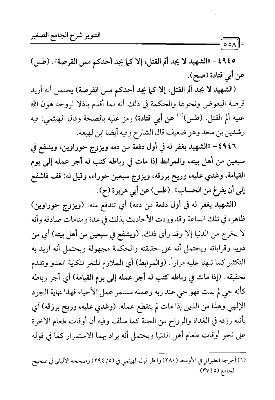 4946 - "الشهيد يغفر له في أول دفعة من دمه ويزوج حوراوين، ويشفع في سبعين من أهل بيته، والمرابط إذا مات في رباطه كتب له أجر عمله إلى يوم القيامة، وغدي عليه، وريح برزقه، ويزوج سبعين حوراء، وقيل له: قف فاشفع إلى أن يفرغ من الحساب". (طس) عن أبي هريرة (ح).